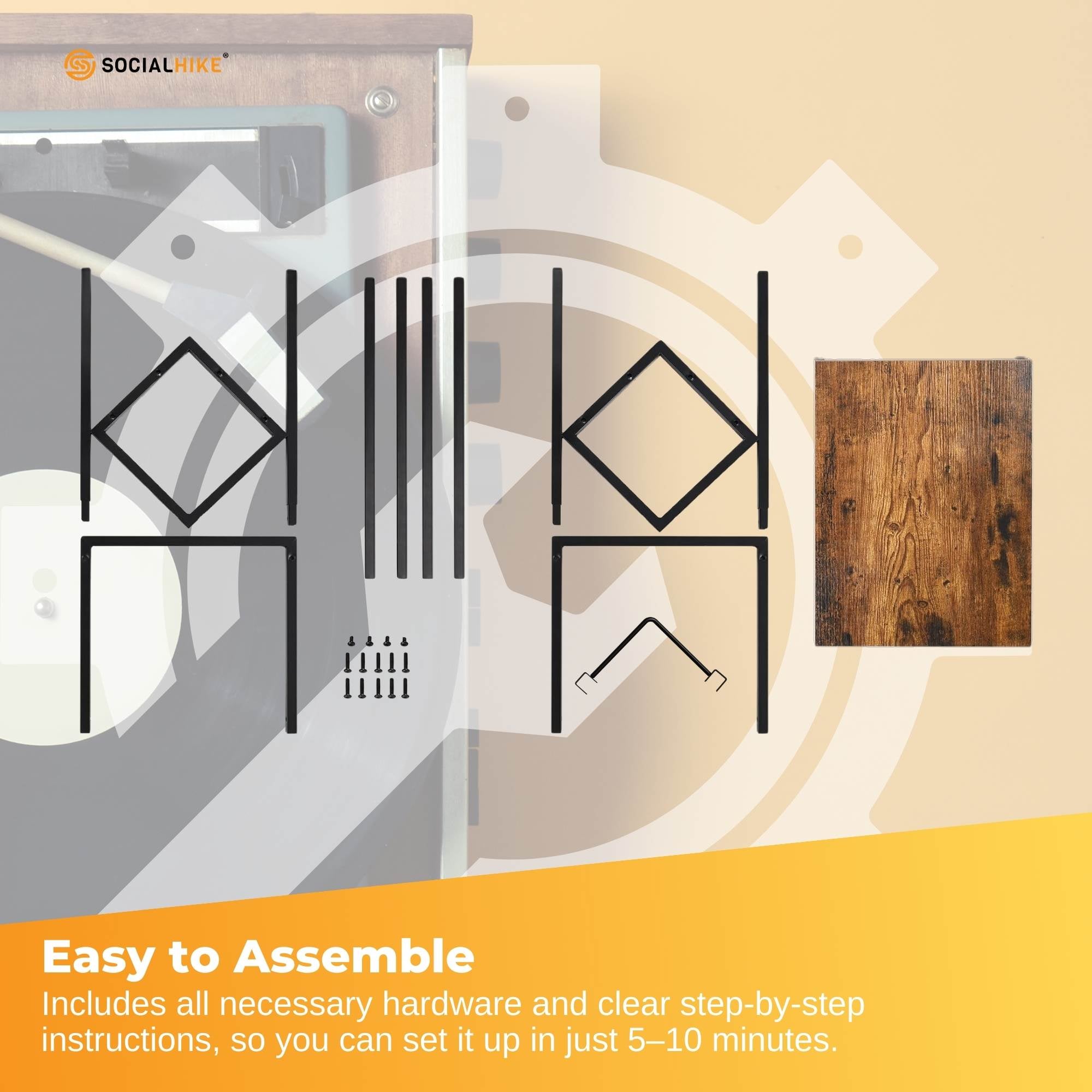 Upgrade your music space with this Social Hike Turntable Player Stand Vinyl LP Record Album Storage – Black Metal. A stylish and functional record player stand, designed to keep your vinyl collection organised. Featuring a spacious two-tier design, this stand holds up to 80–100 records, with a V-shaped metal storage rack for easy access to your favourite albums. The rustic brown wooden tabletop blends seamlessly with a modern matte black metal frame, adding a touch of vintage charm to any room.