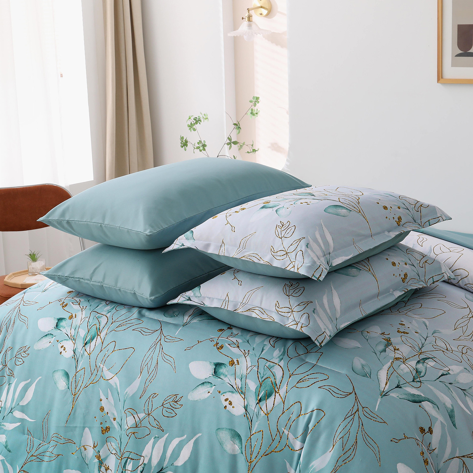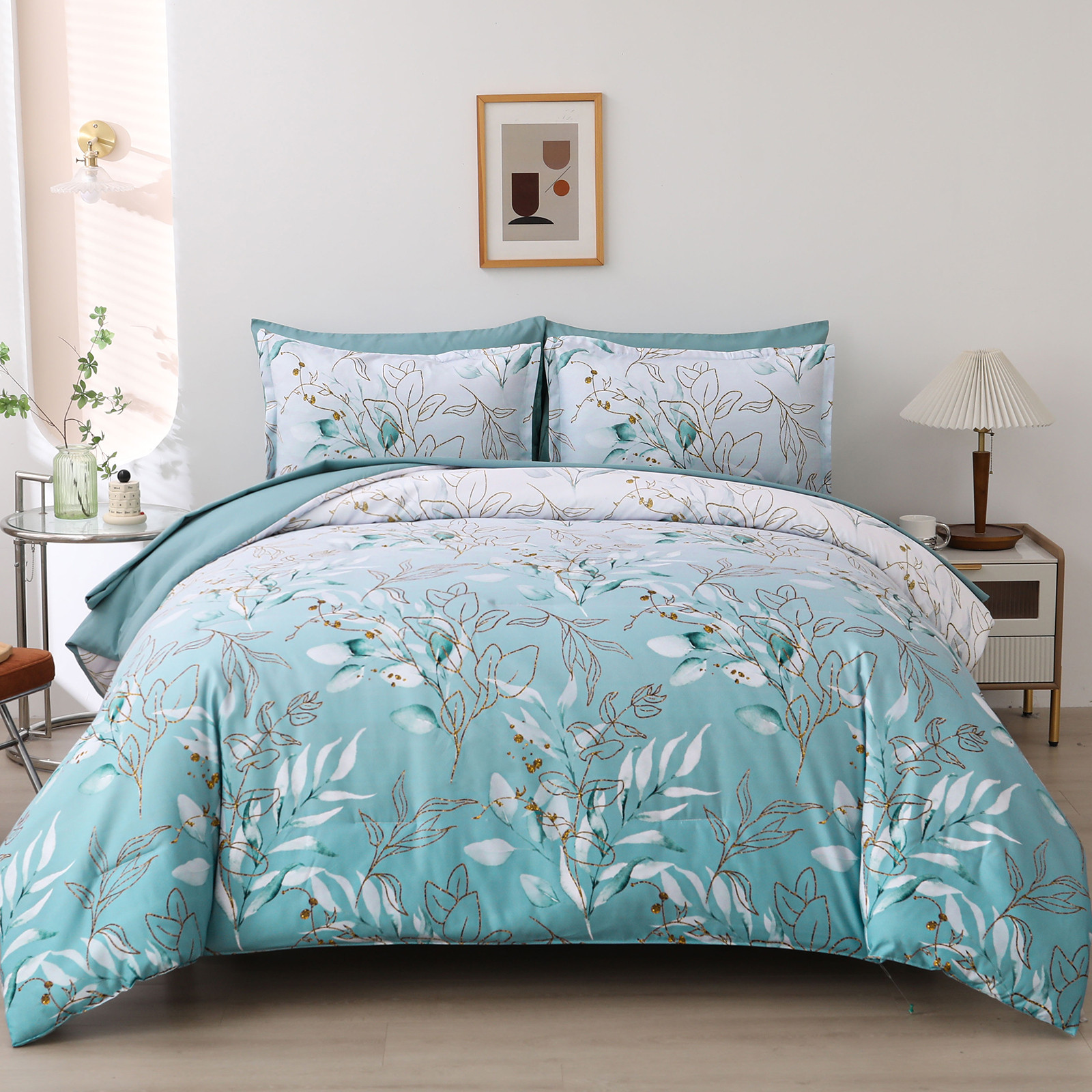 Soft Floral Leaf Comforter Set, King Size, Quilted Cozy Bedding with Pillowcases