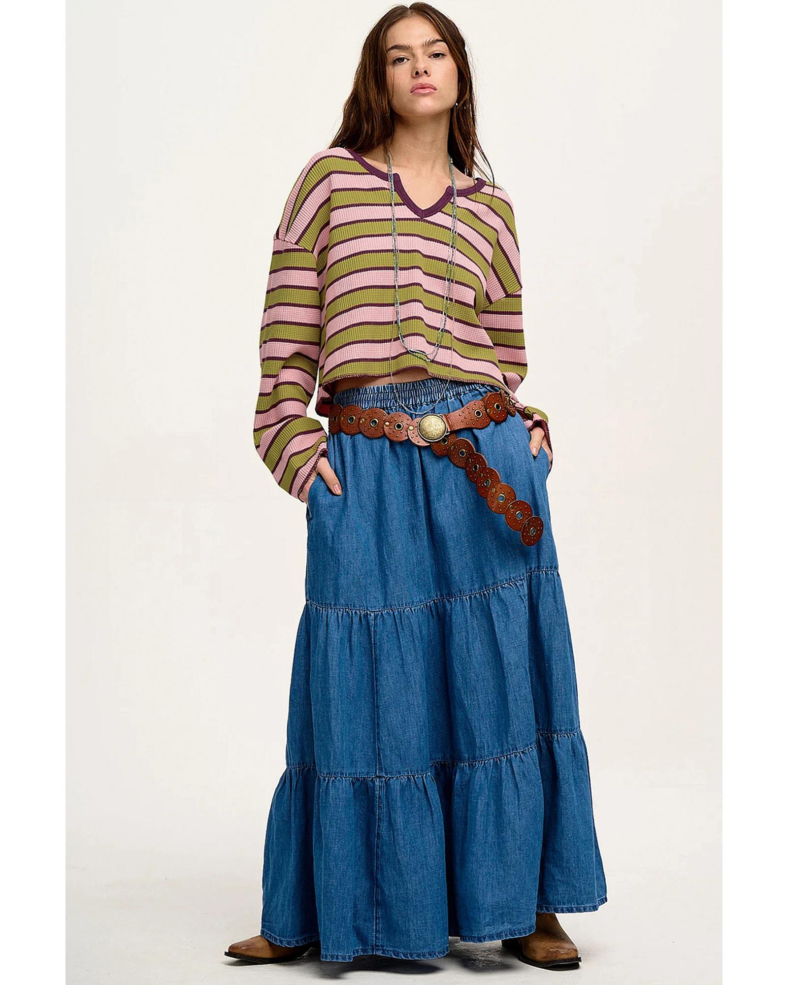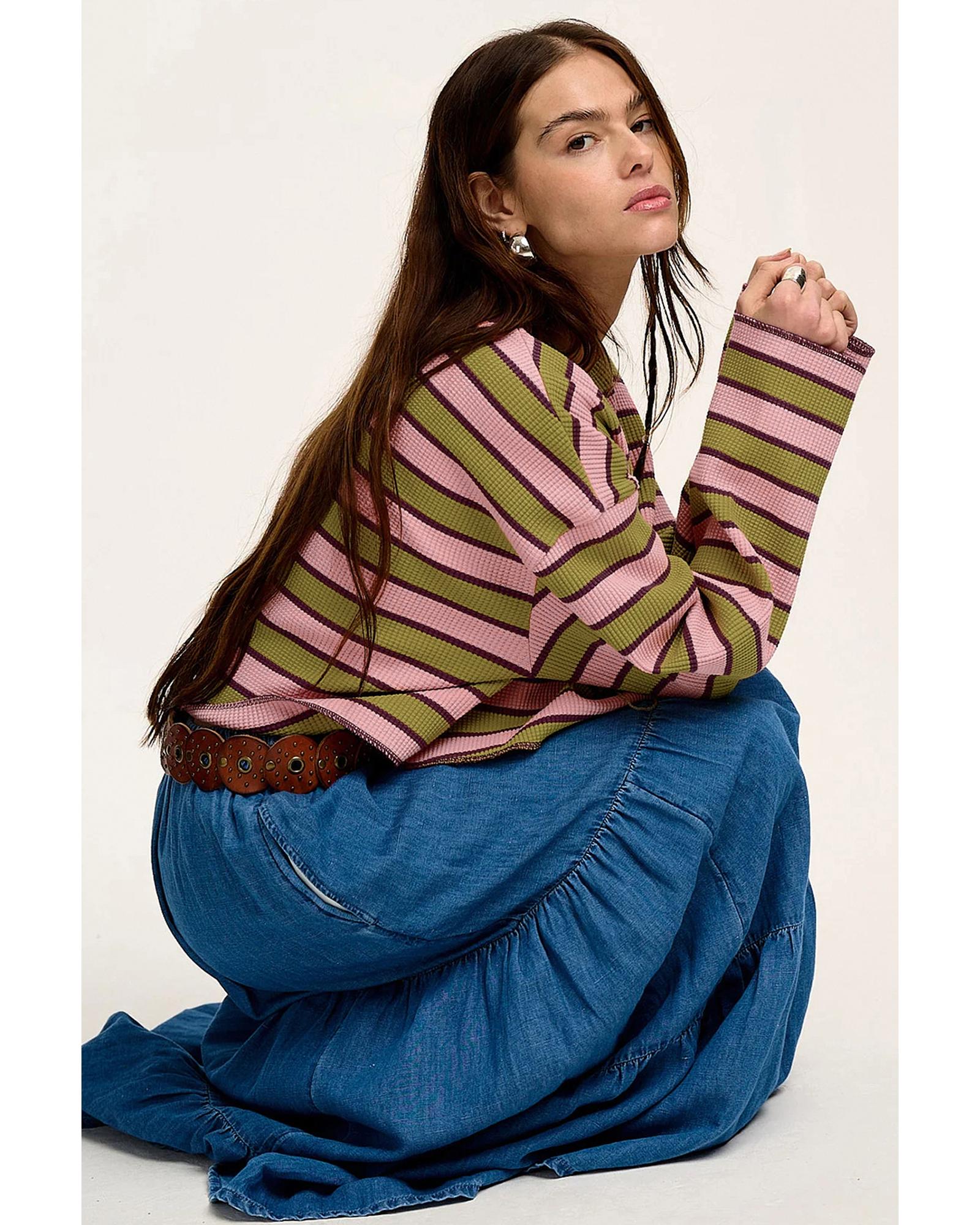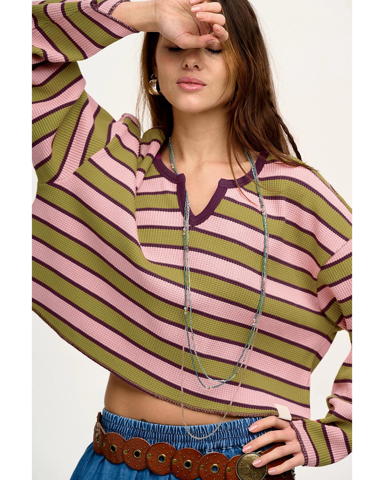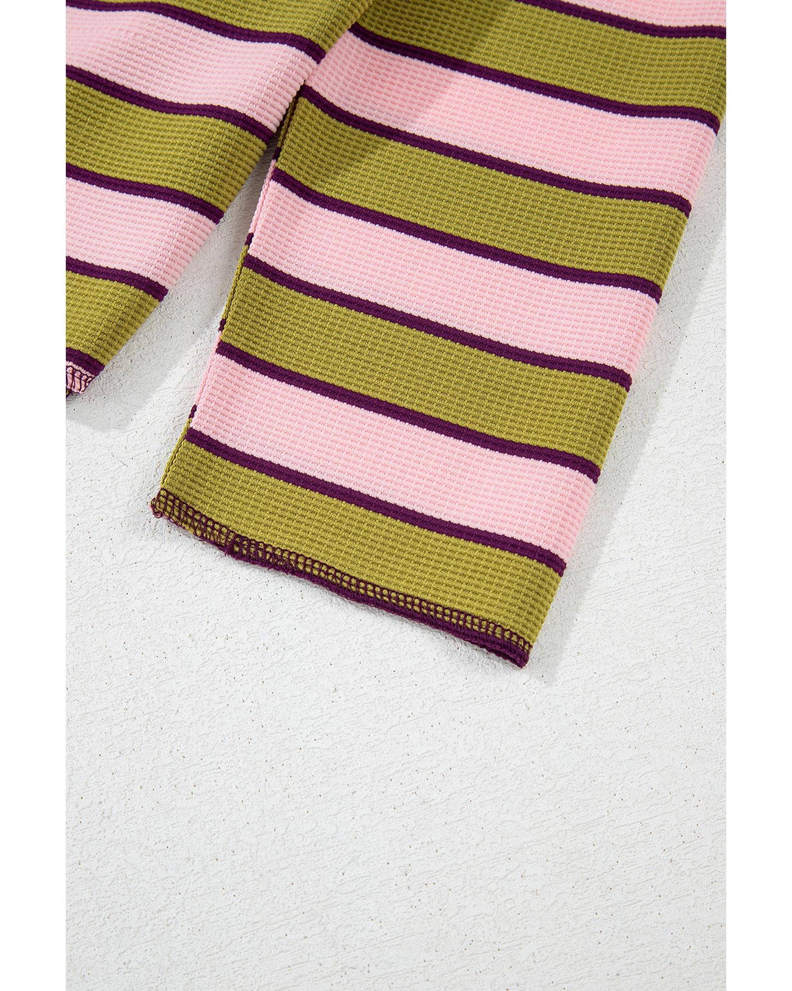 Spinach Green Clashing Stripes Waffle Texture Notched Neck Long Sleeve Top – L