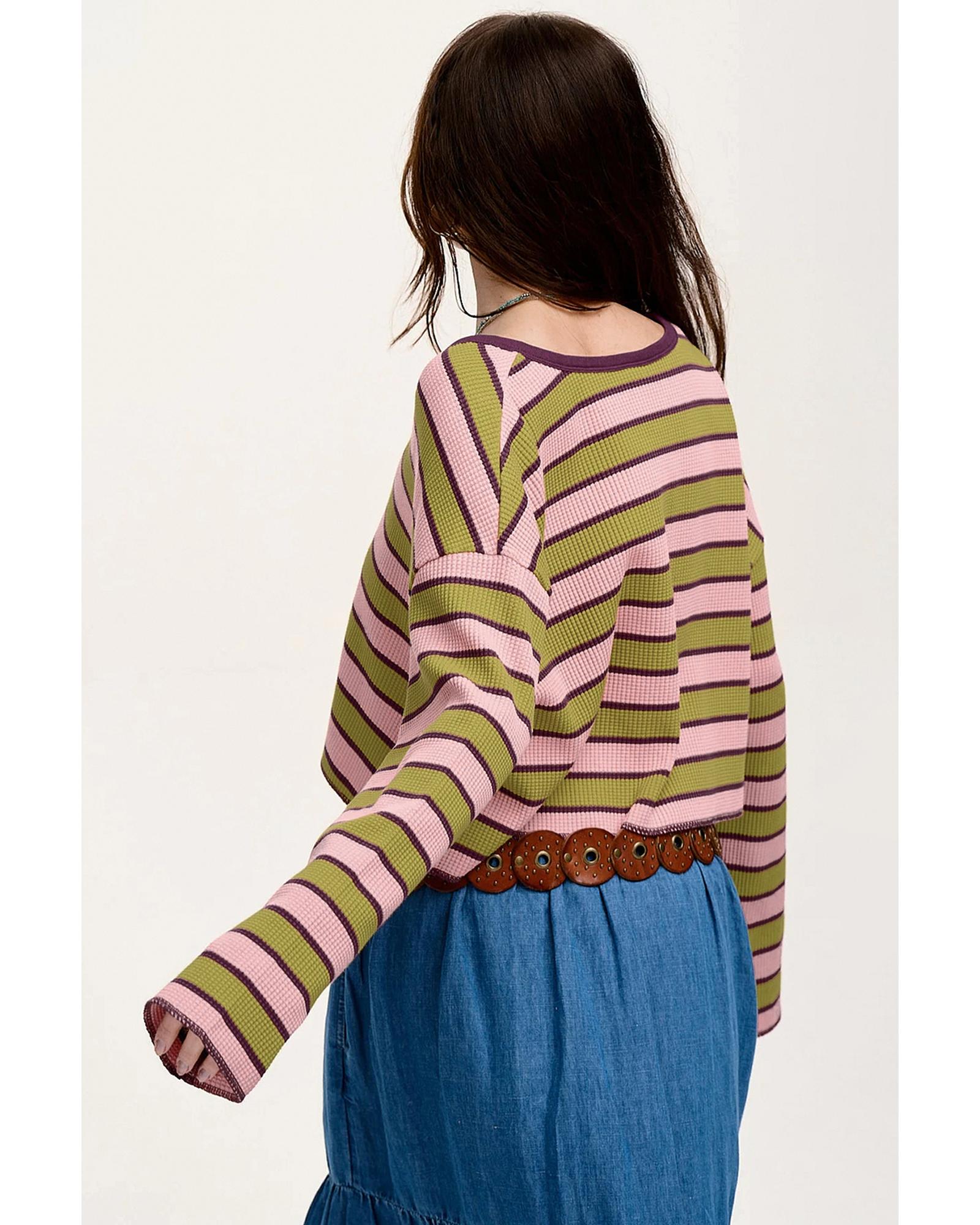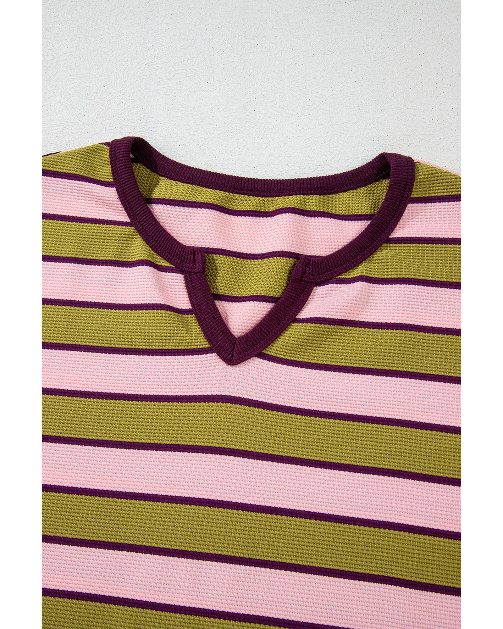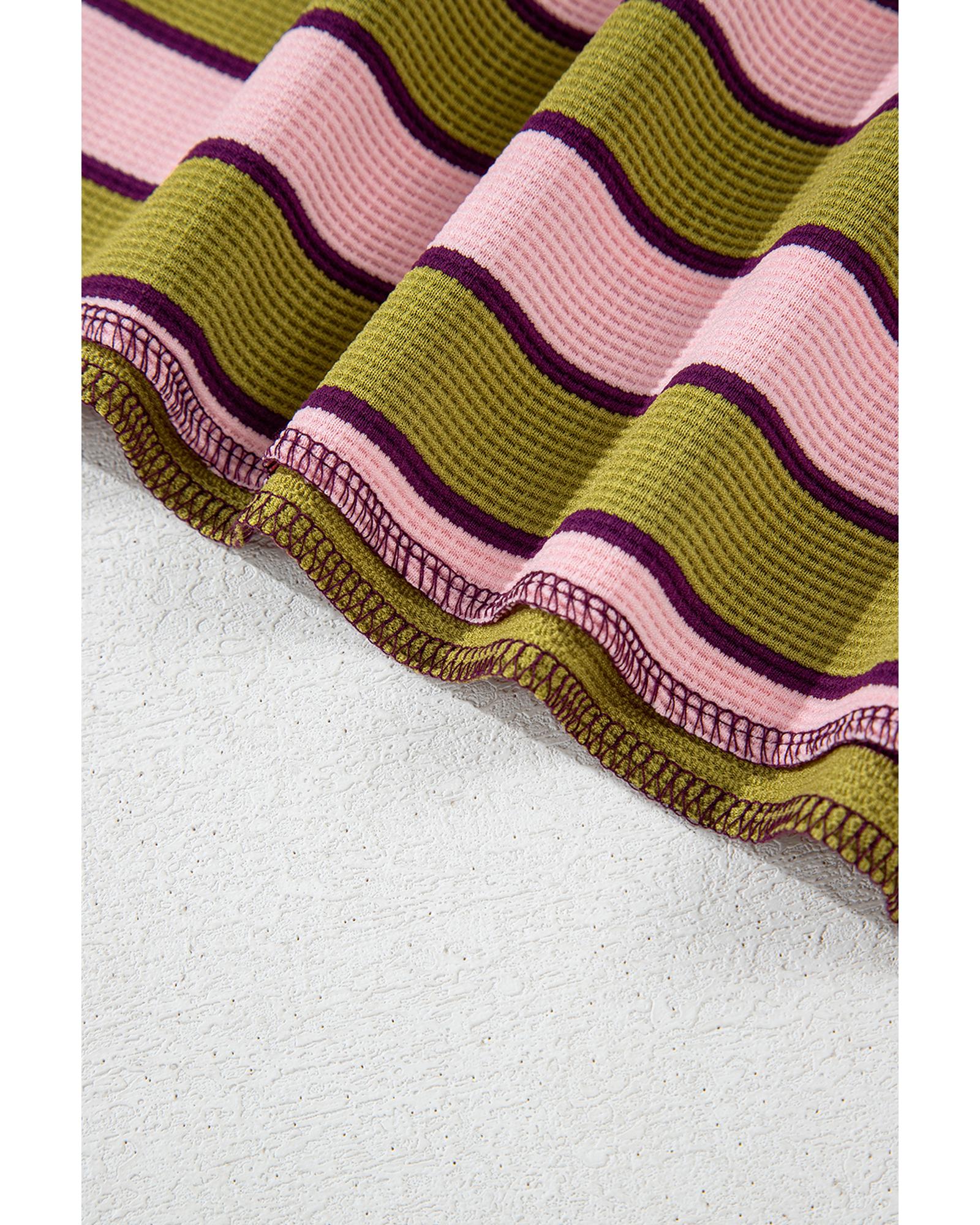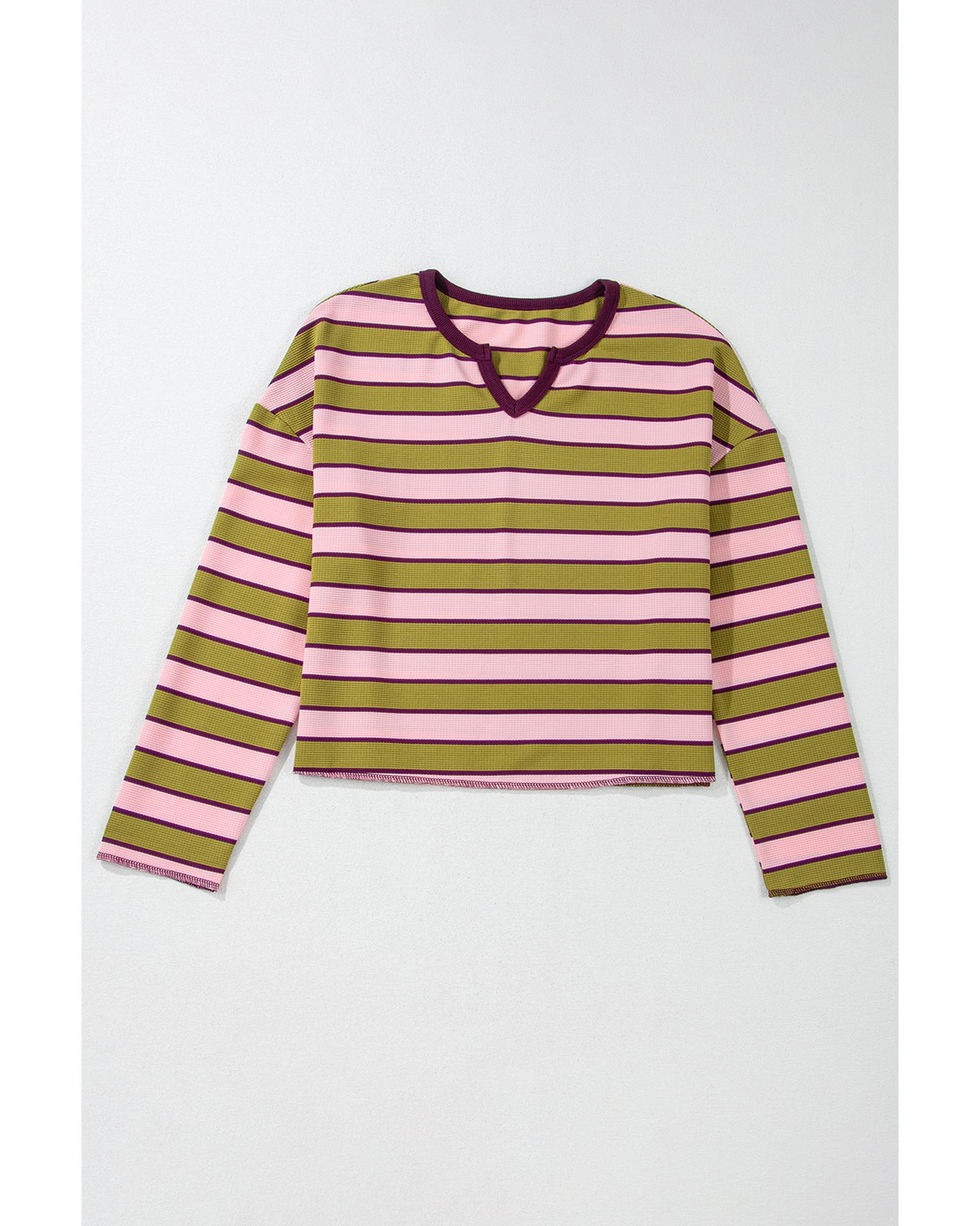 Spinach Green Clashing Stripes Waffle Texture Notched Neck Long Sleeve Top – M