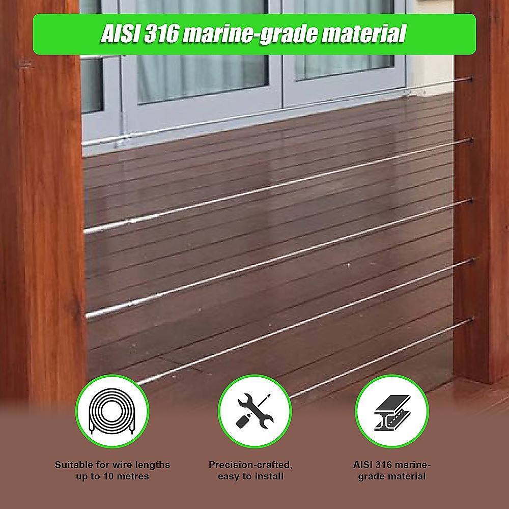 If you're planning to upgrade your residential or commercial property with a wire balustrade, these rugged, durable terminal lag screws by Randy Travis Machinery work equally well with both vertical and horizontal runs of balustrade or landscaping wire. This 20-piece set works with 3.2-millimetre wire up to 10 metres in length.