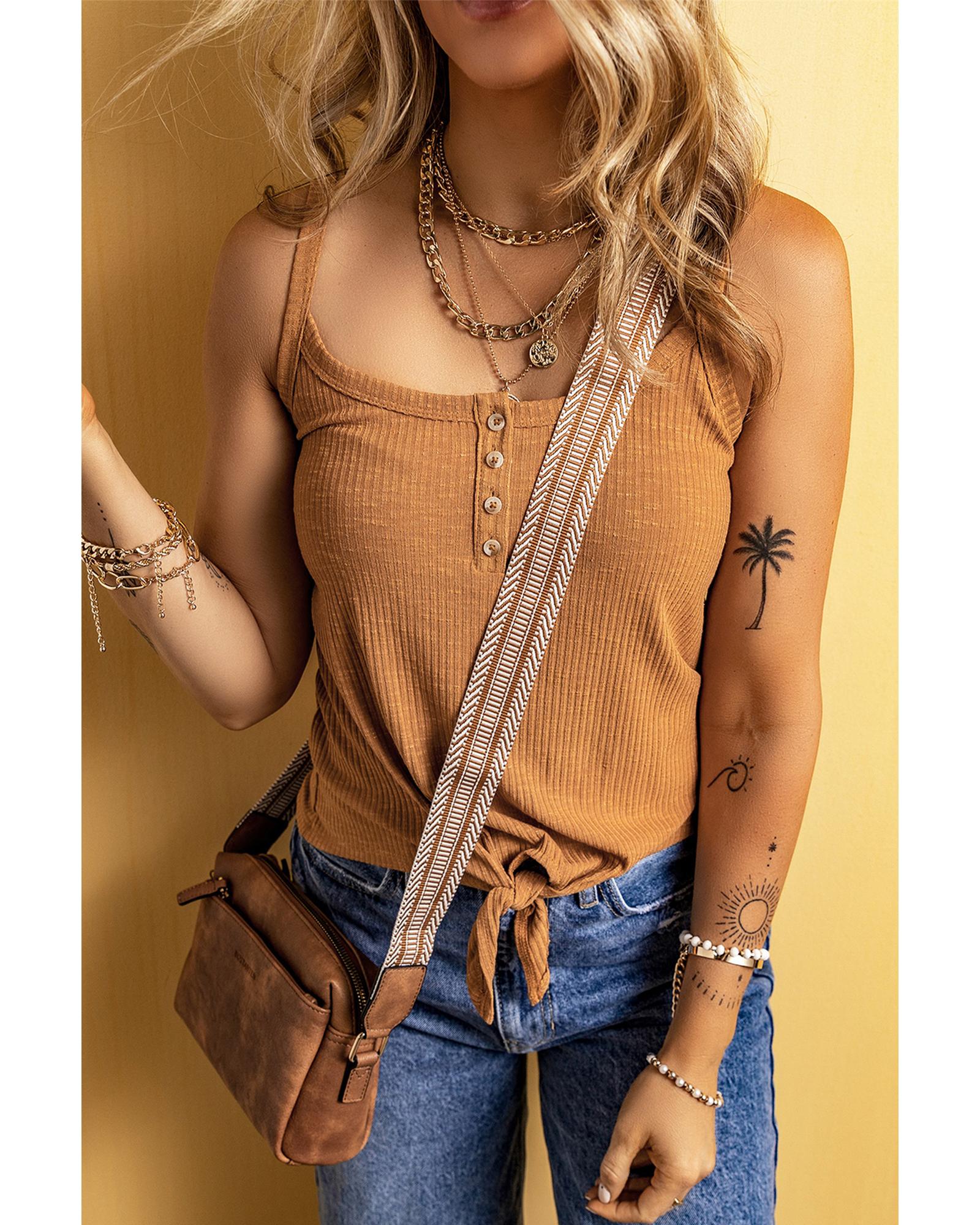 Straw Yellow Ribbed Front Knot Buttoned Thin Strap Tank Top – XL