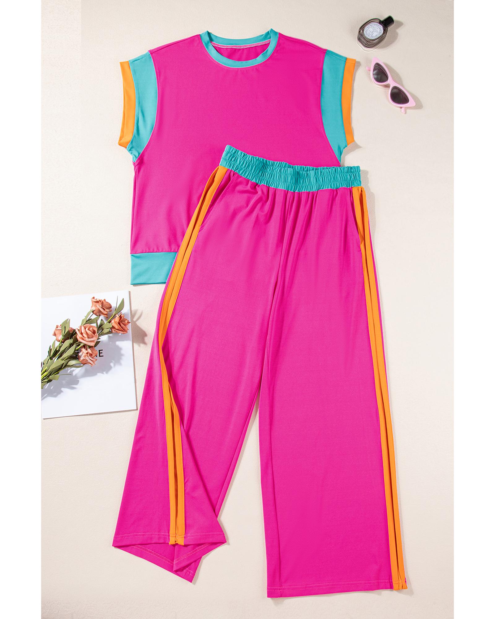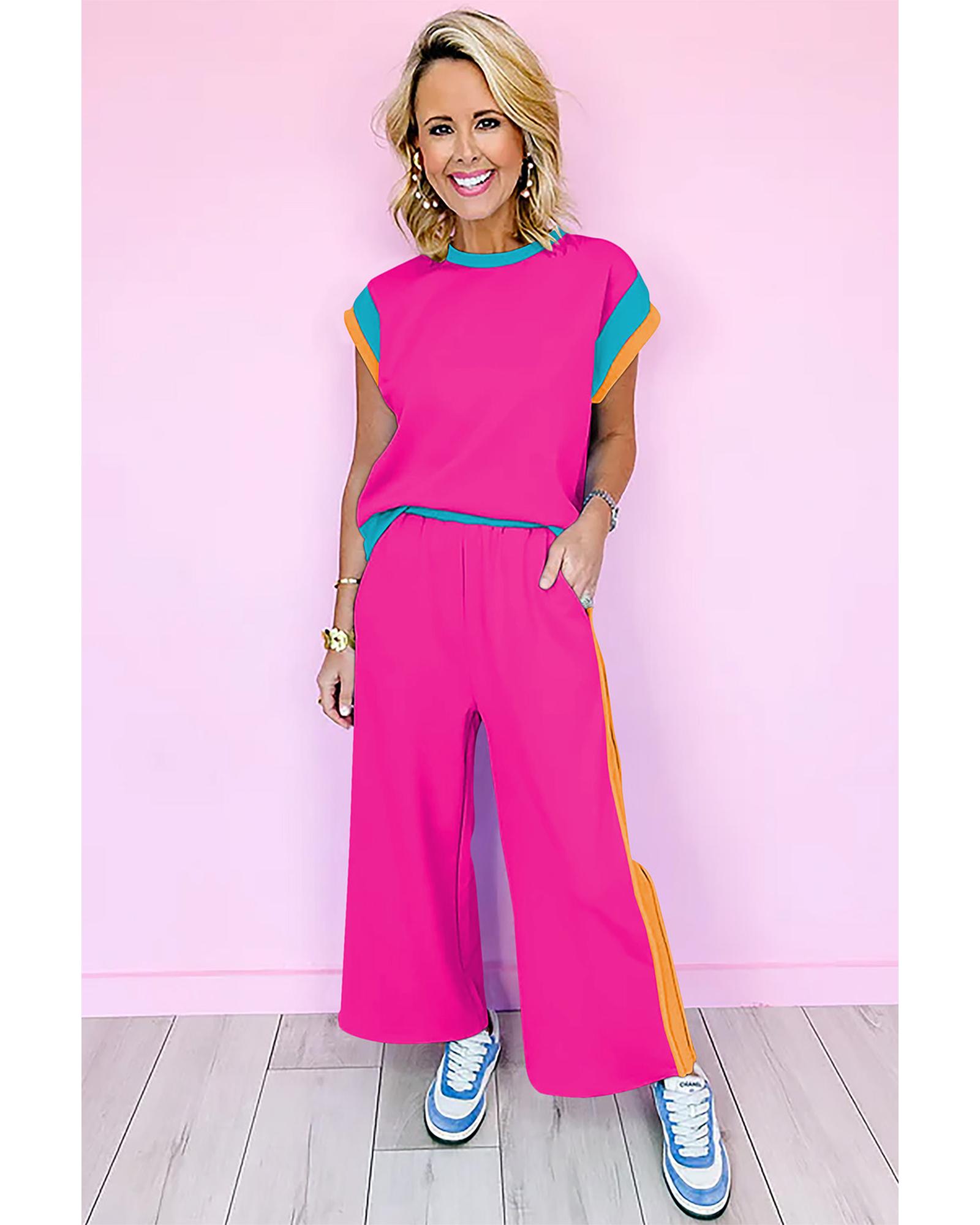 Strawberry Pink Color Block Detail Casual Two-piece Set – L