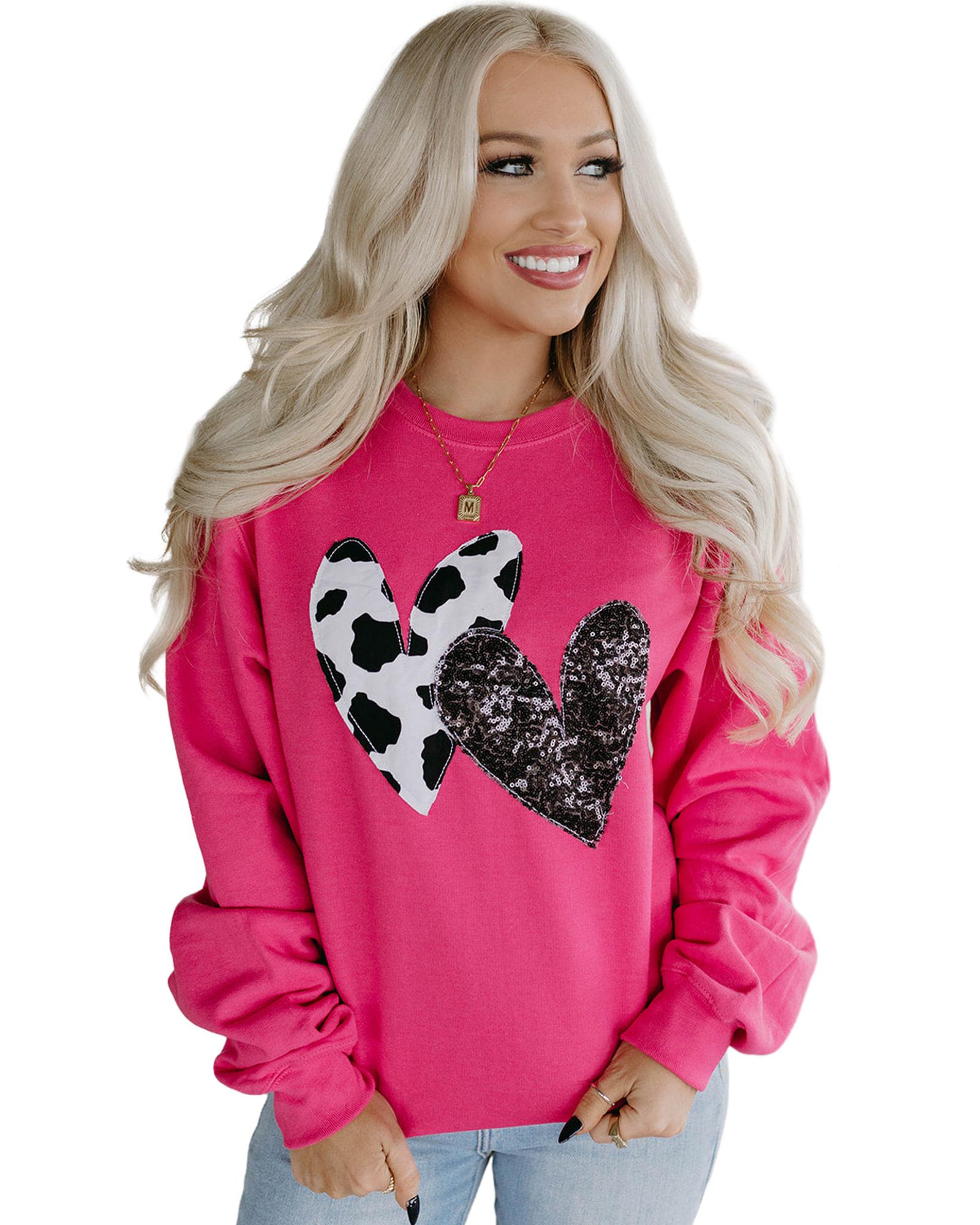 Strawberry Pink Cow & Sequin Double Heart Patch Graphic Sweatshirt – S