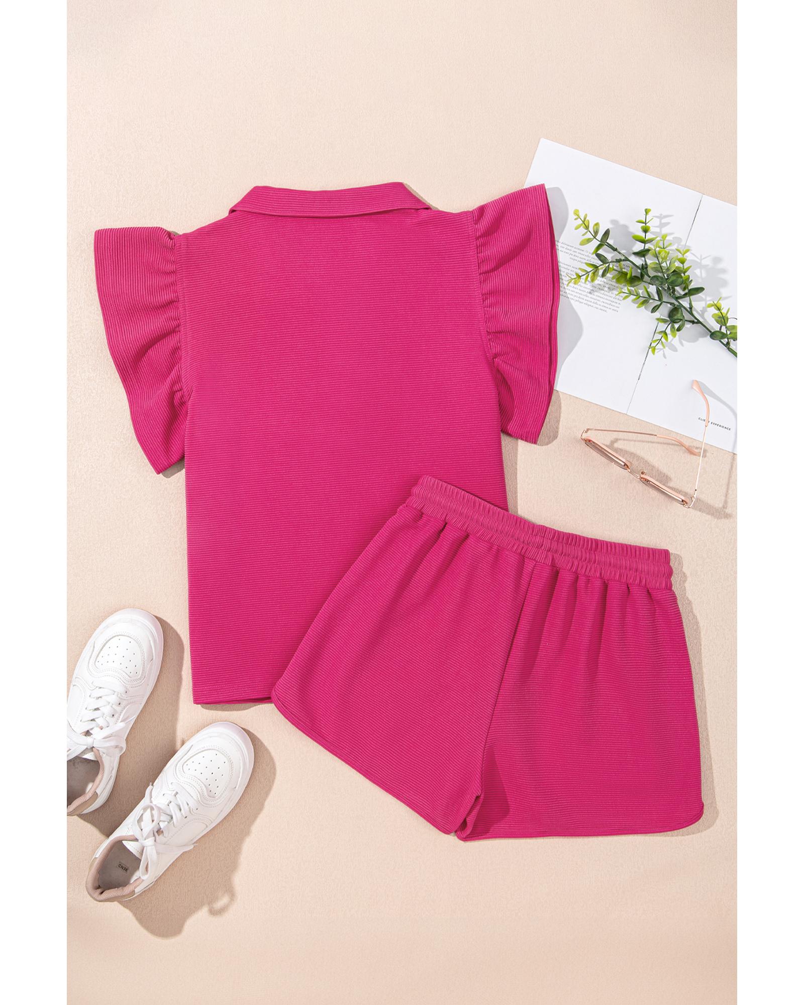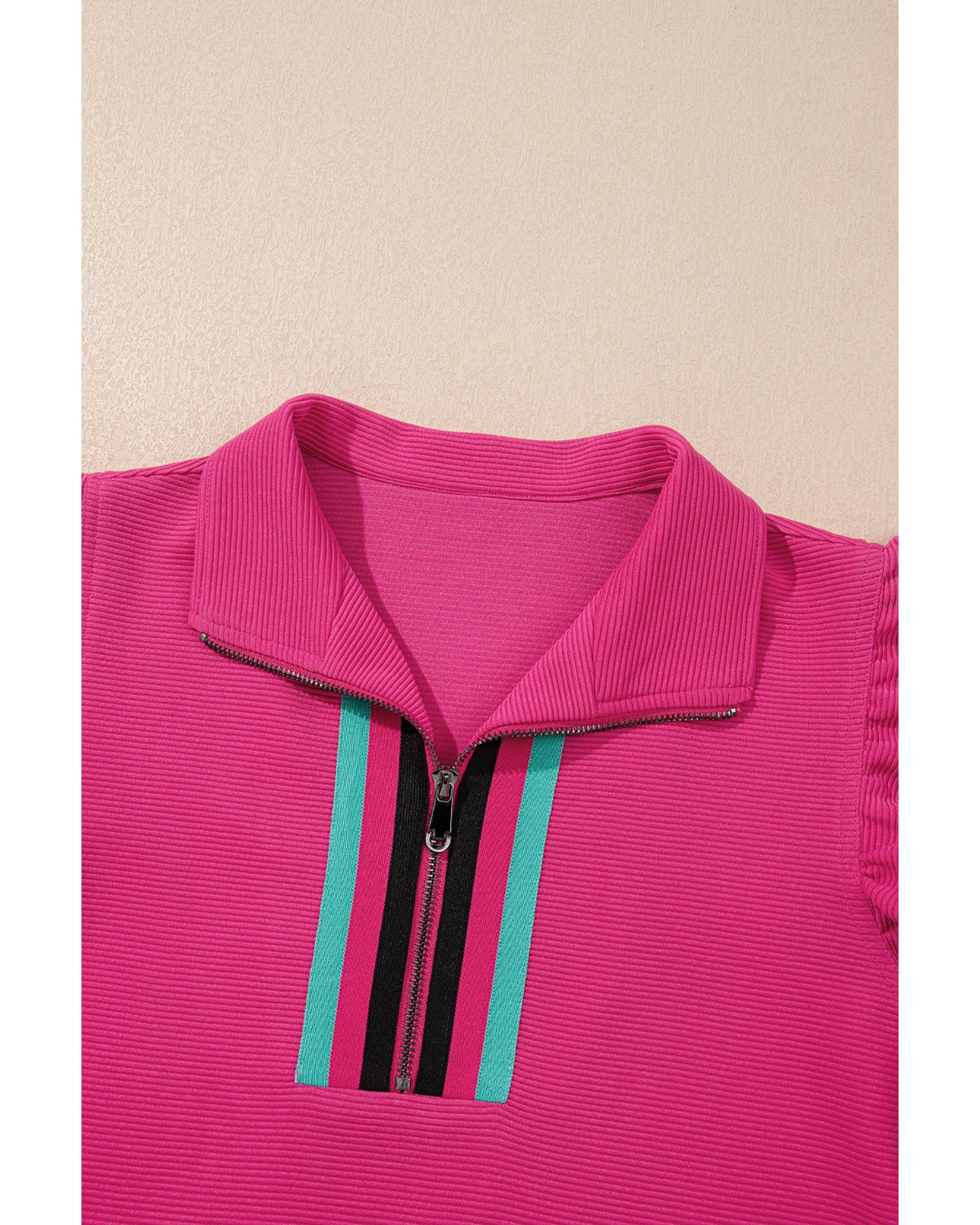 Strawberry Pink Striped Detail Flutter Sleeve Zipped Collar Short Set – S