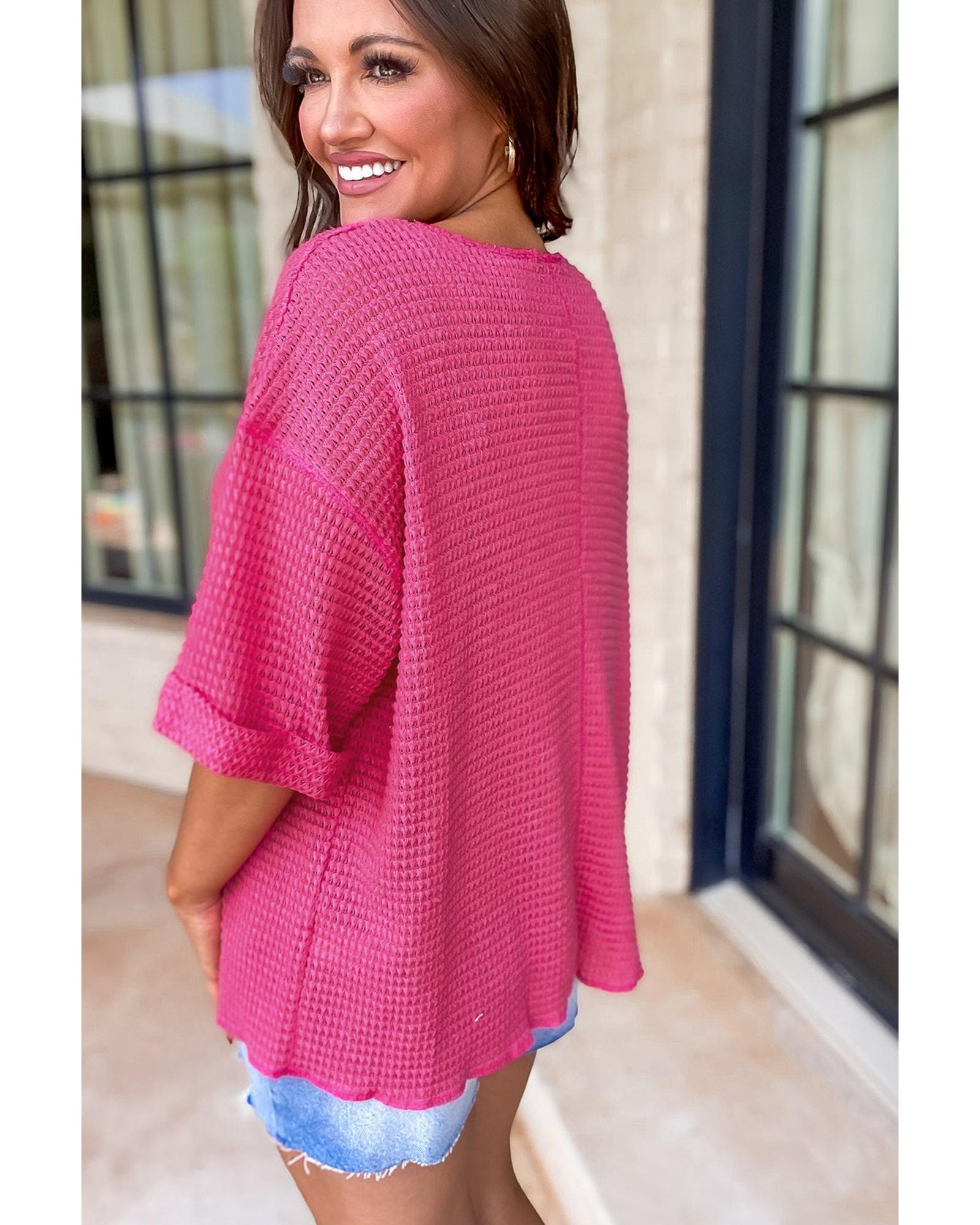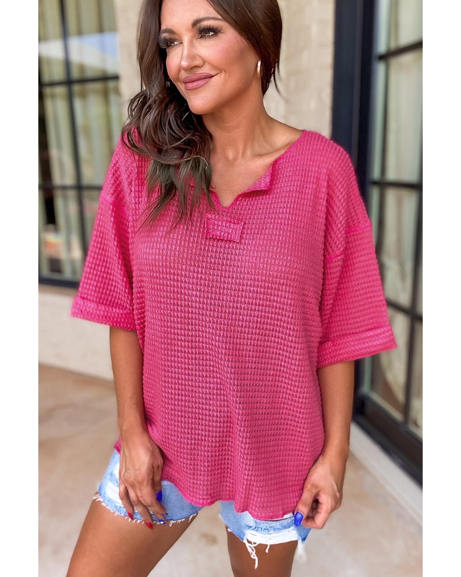 Strawberry Pink Textured Knit Split Neck Cuffed Short Sleeve Top – S
