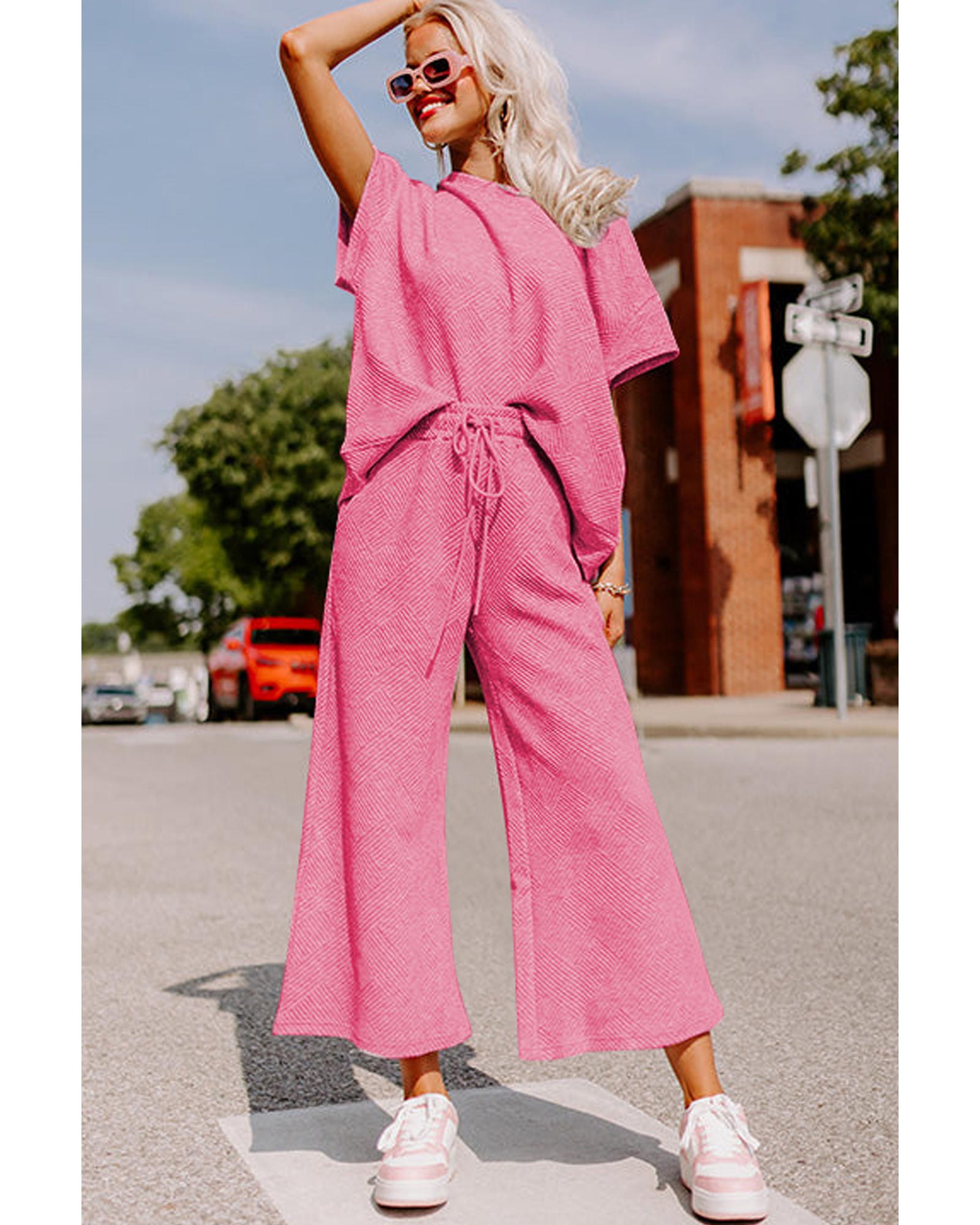 Strawberry Pink Textured Loose Fit T Shirt and Drawstring Pants Set – M