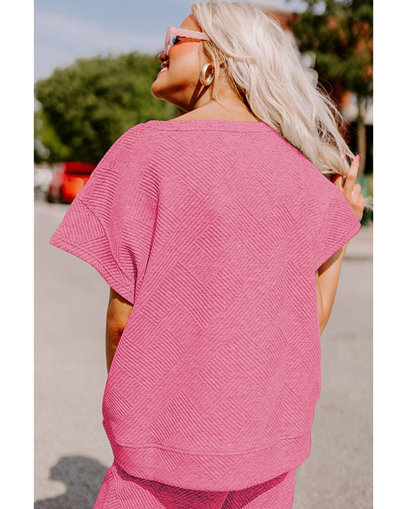 Strawberry Pink Textured Loose Fit T Shirt and Drawstring Pants Set – XL
