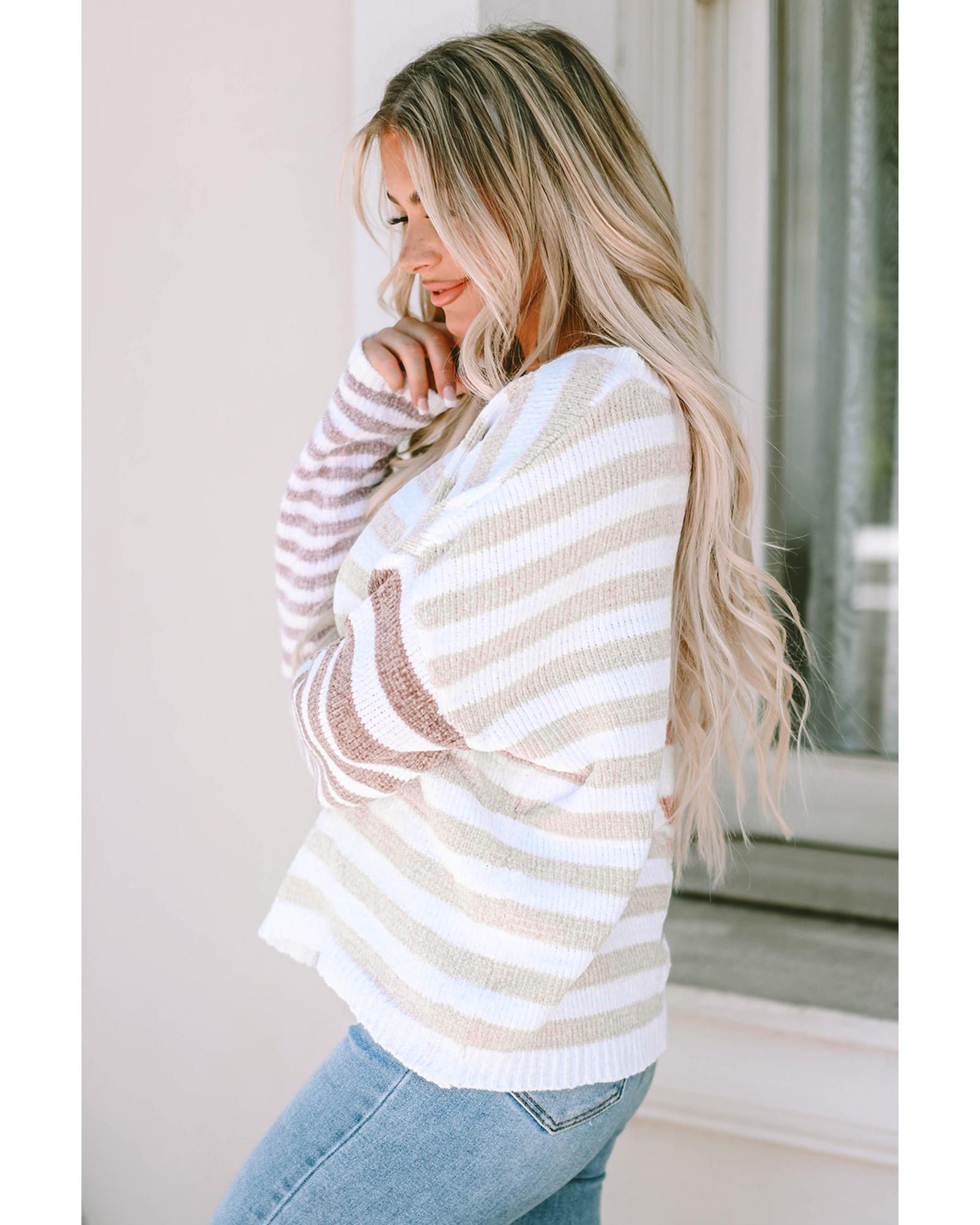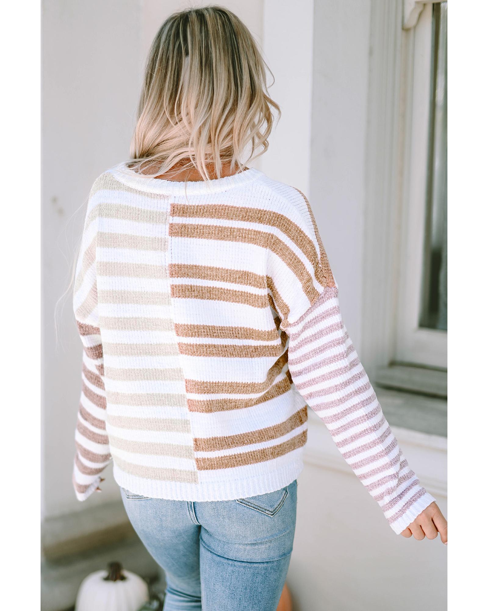 - Super fun knit sweater with multi colors in the stripe and a fun blocking pattern