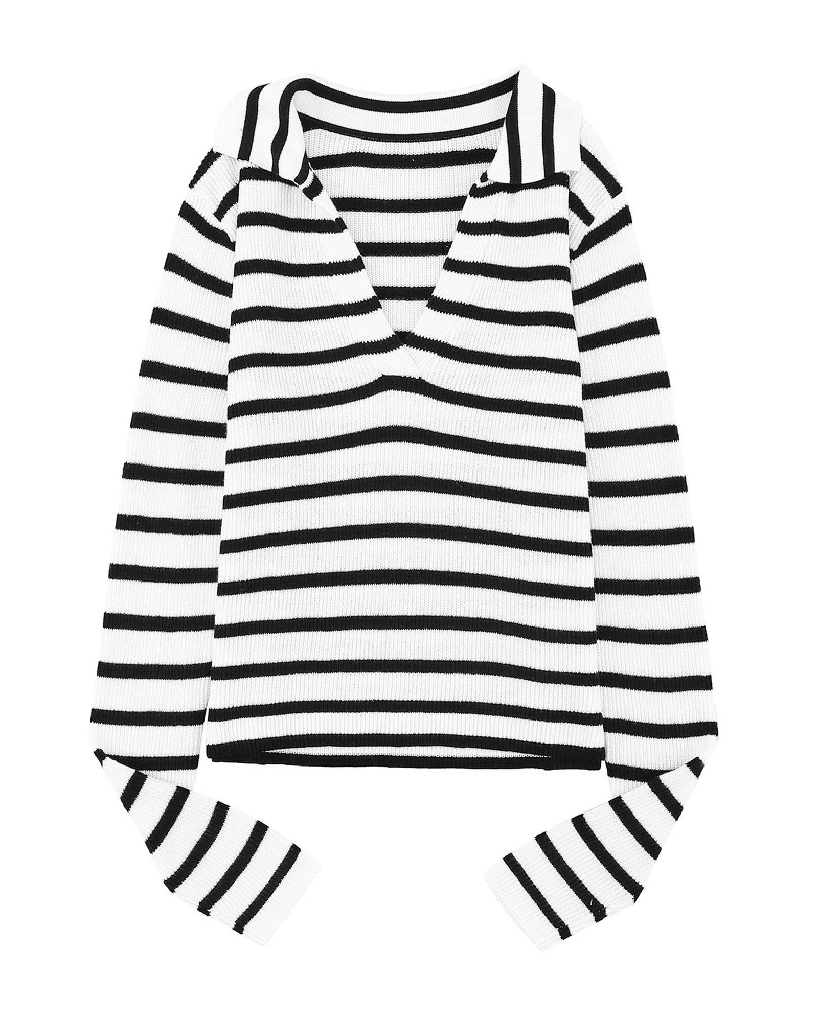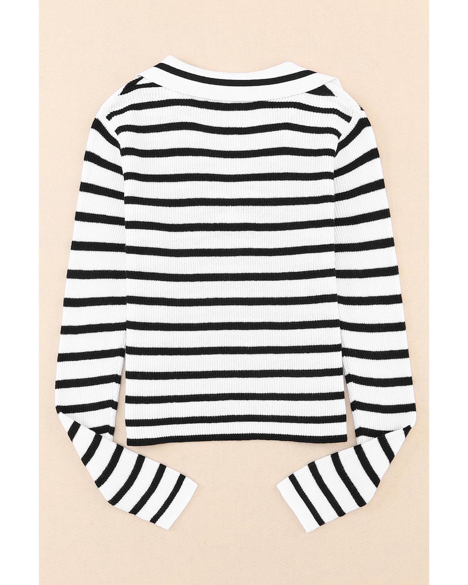 Stripe Collared V Neck Lightweight Knit Casual Sweater – M