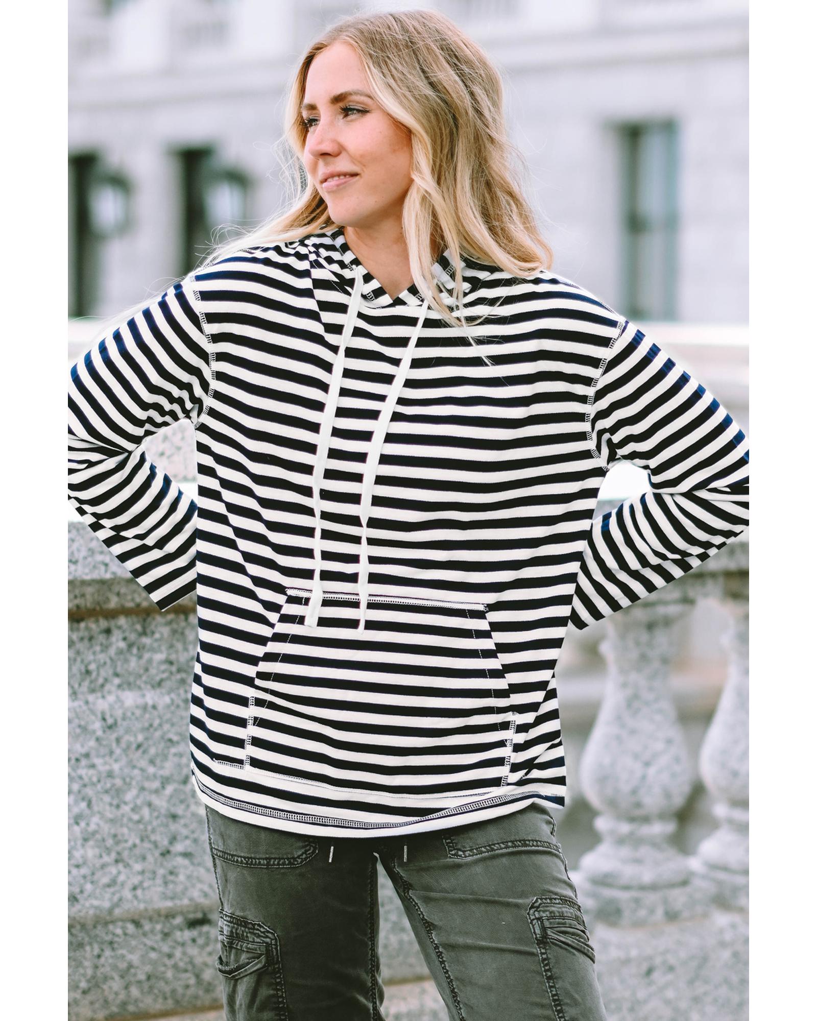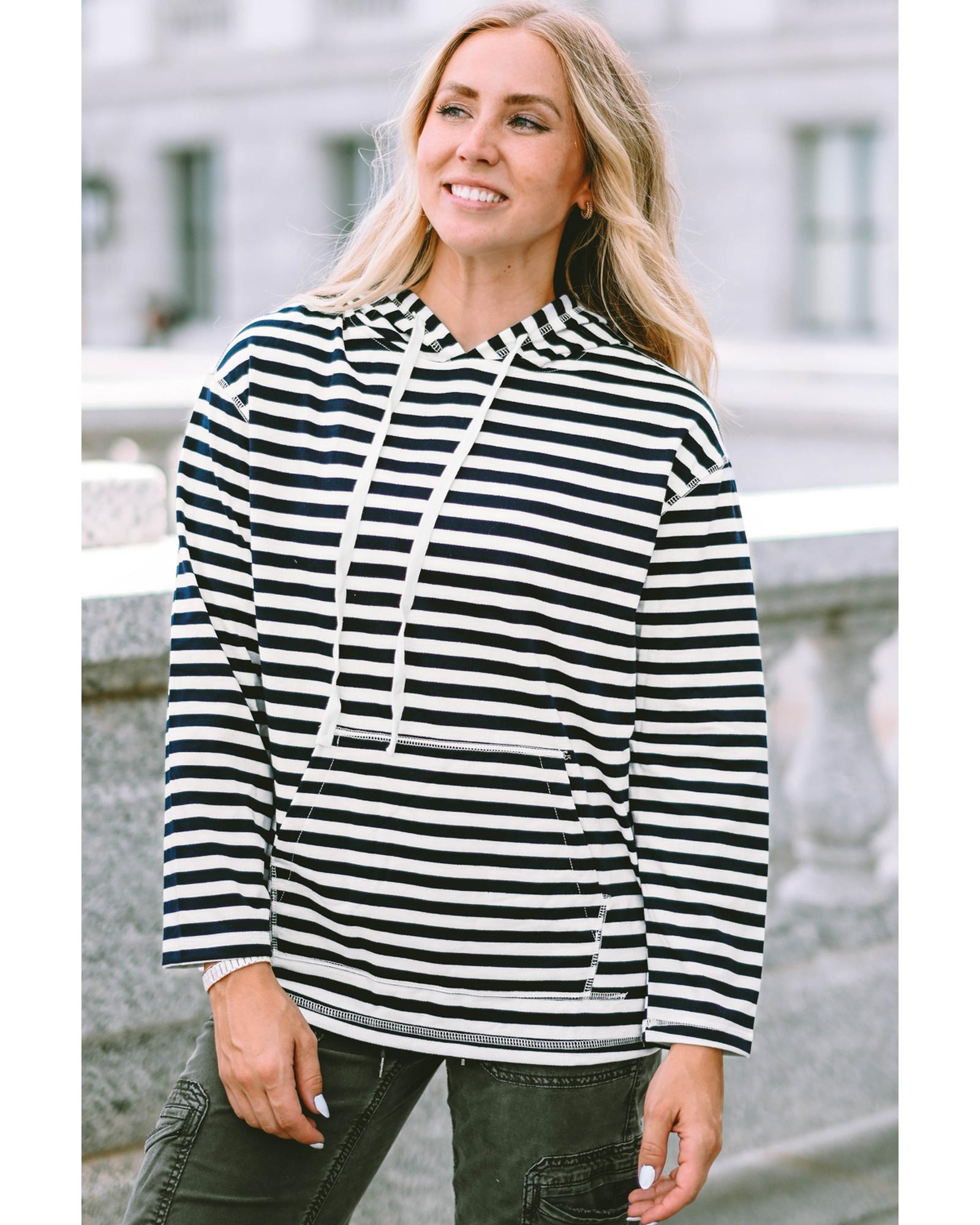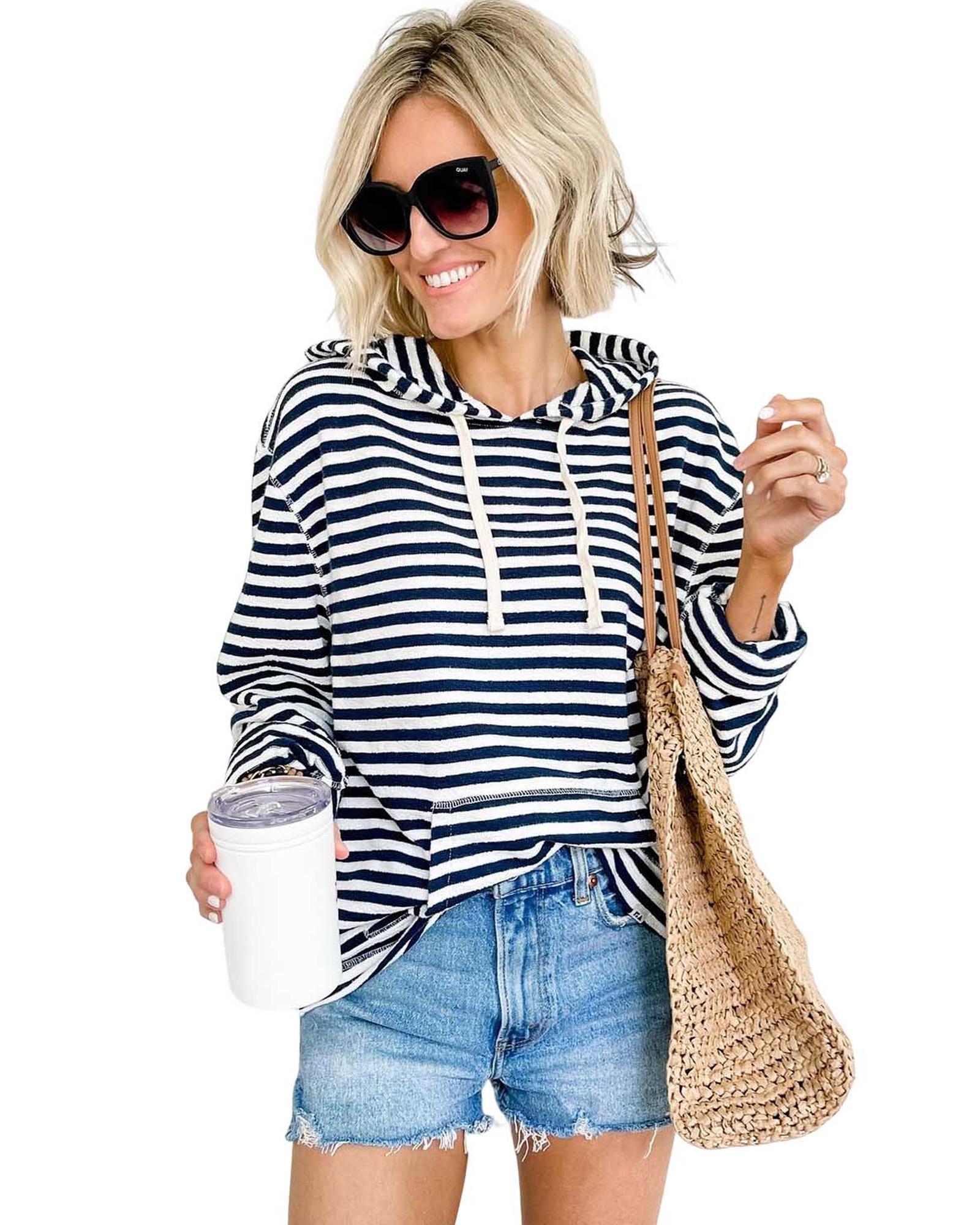Trendy drawstring hoodie for spring and autumn Simple striped print for timeless style Kangaroo pocket for added design and functionality Well