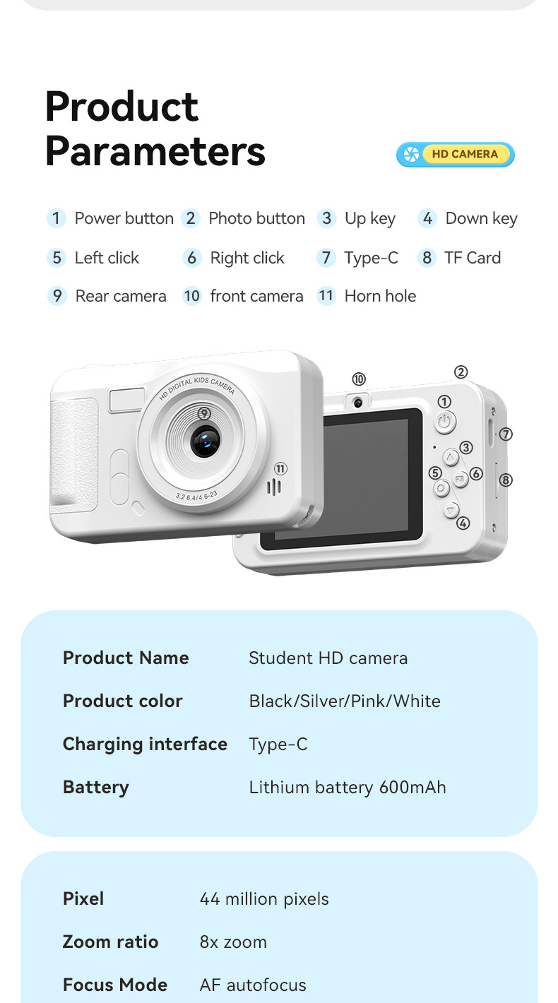 Unleash creativity with our Student HD Digital Camera, perfect for capturing life’s adventures with impressive clarity and ease. This camera boasts a high-resolution 44 million pixel sensor for stunning photos, an 8x digital zoom to get closer to the action, and reliable AF autofocus for sharp, well-defined images. Featuring dual cameras (front and rear), HD video recording capabilities, and a long-lasting 600mAh lithium battery with convenient Type-C charging, it’s designed for extended use and simple operation. Explore various shooting modes and add a touch of fun with multiple built-in filters like Normal, Nostalgia, Black and White, and Film. This camera is an excellent choice for students and young photography enthusiasts looking to record excitement and create master-level shots.