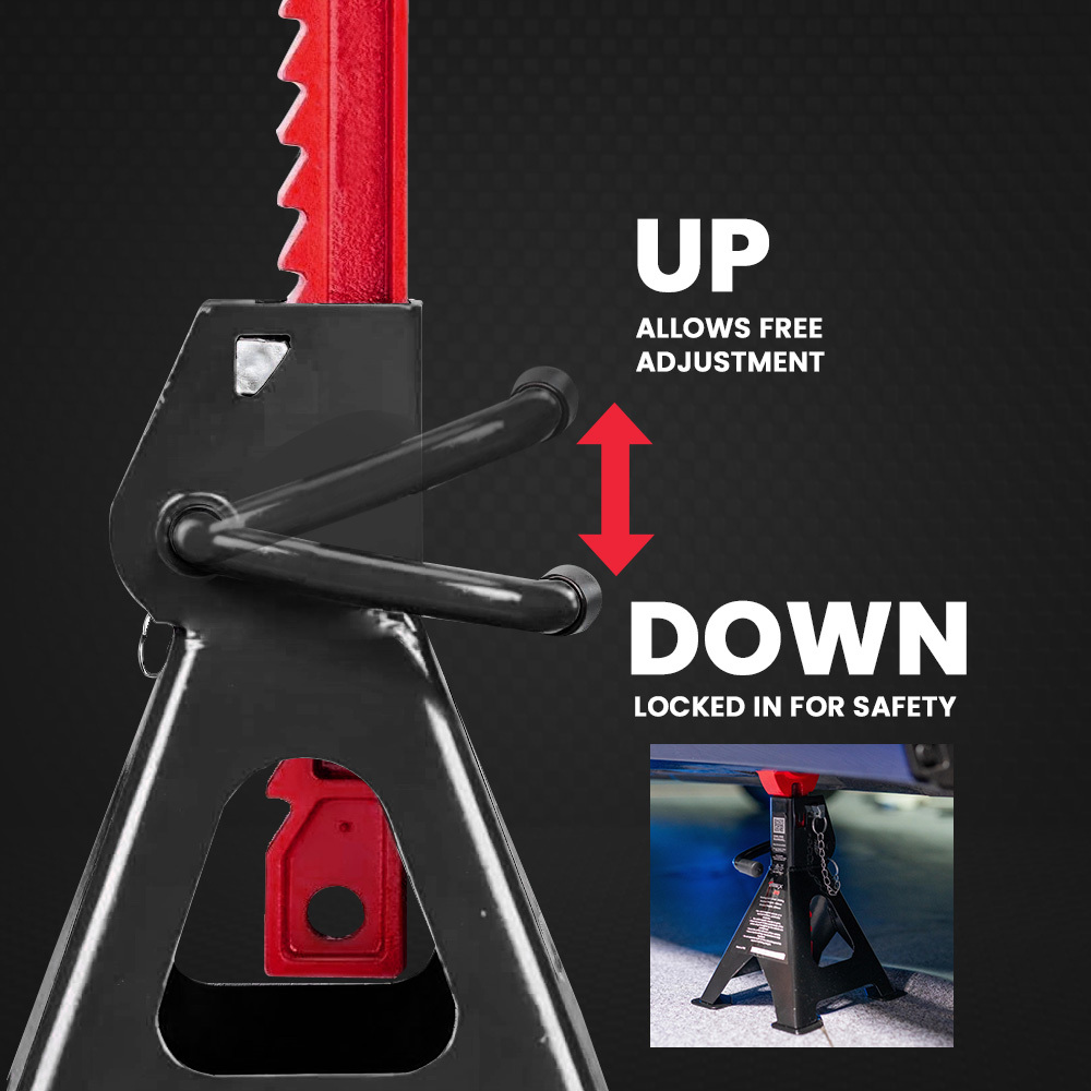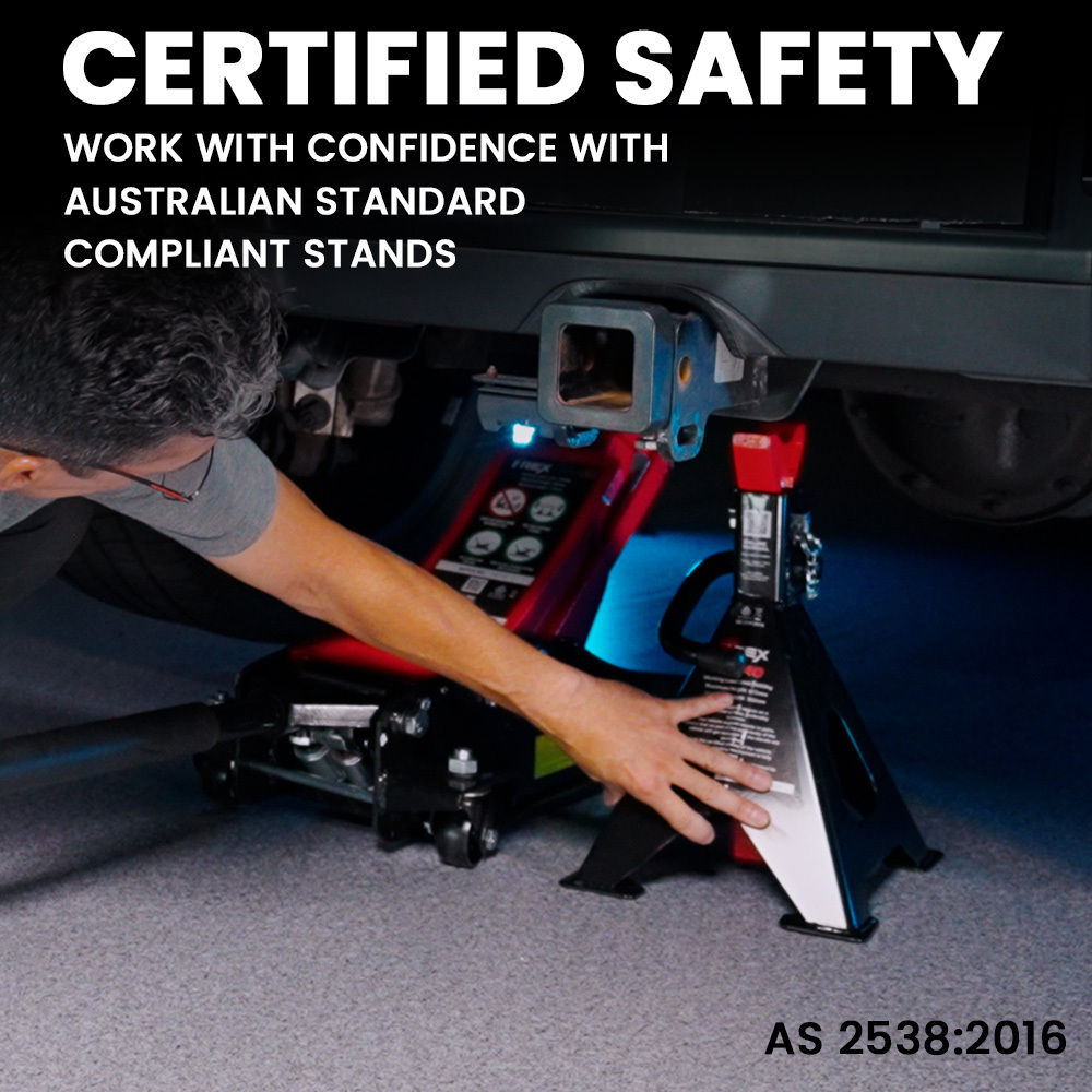 Crafted from durable steel, these Jack Stands prioritise safety through a ratcheting safety lock system, ensuring a solid foundation for any under-vehicle work. Rest assured whilst working under weight with AS 2538:2016 Australian standards compliance.