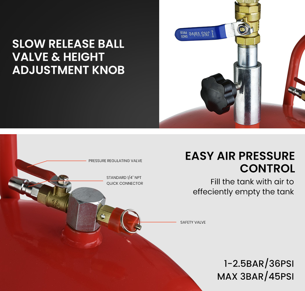 A built-in oil level indicator allows you to easily keep track of your tank capacity, and its steel wire reinforced drain pipe is abrasion, heat and ozone resistant. And, when you’re done, simply connect an air compressor via the standard ¼’ NPT fitting to efficiently push out the waste oil.