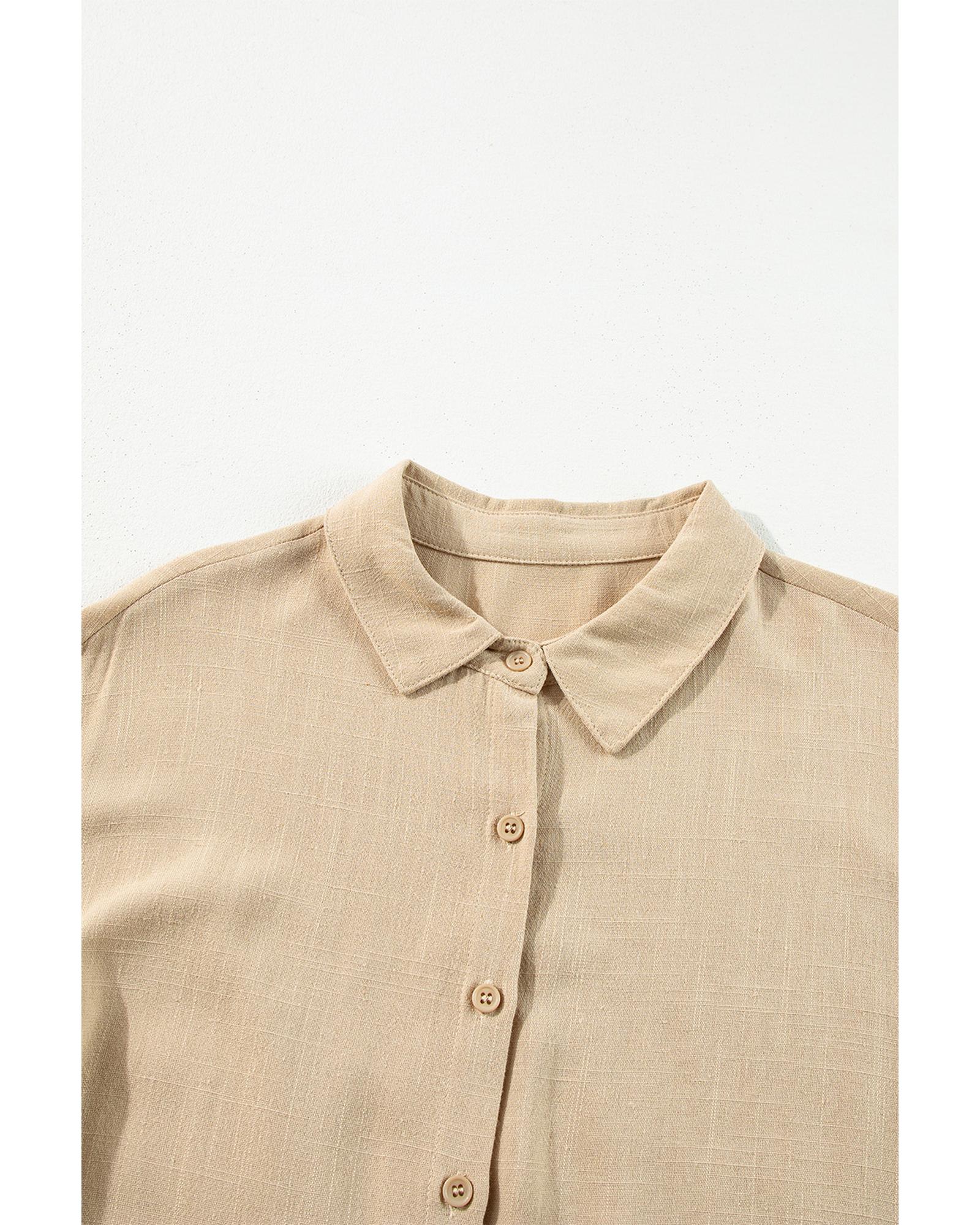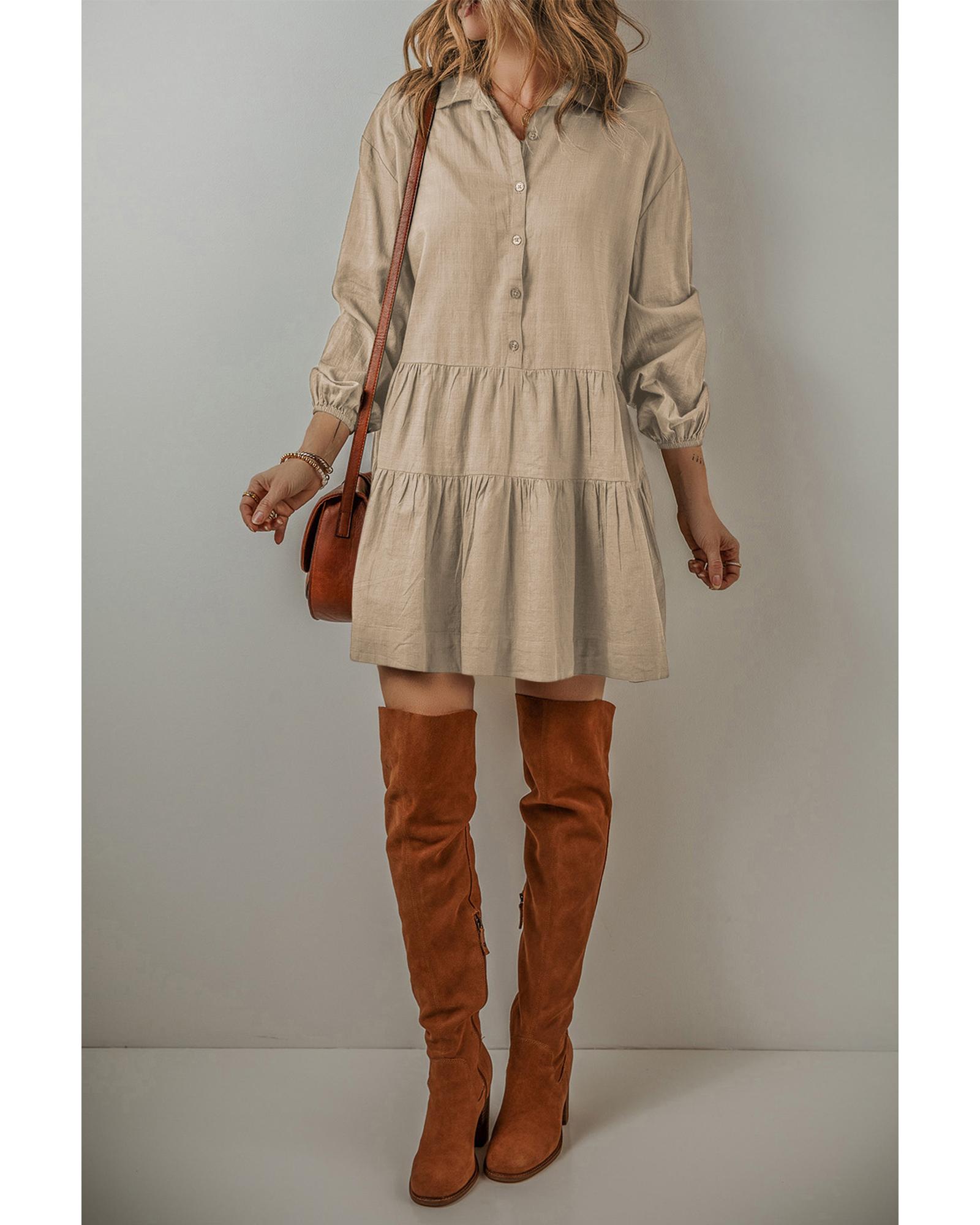 Tan Puff Sleeve Buttoned Tiered Pleated Shirt Mini Dress – M
