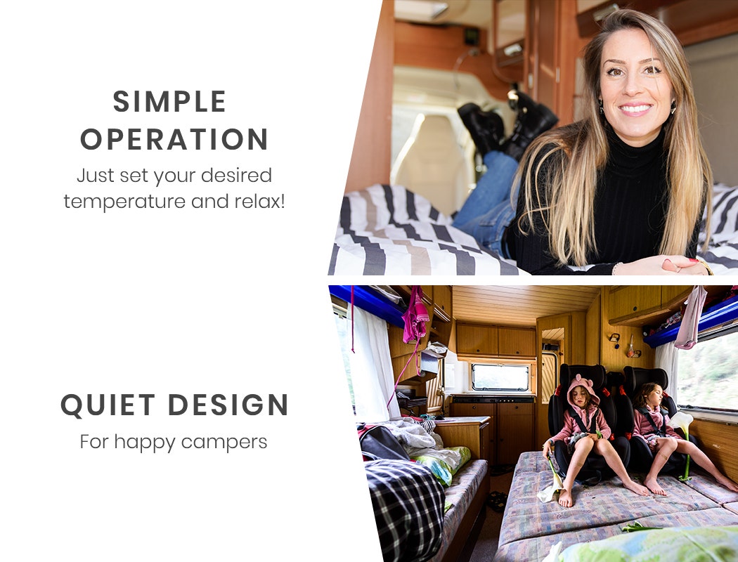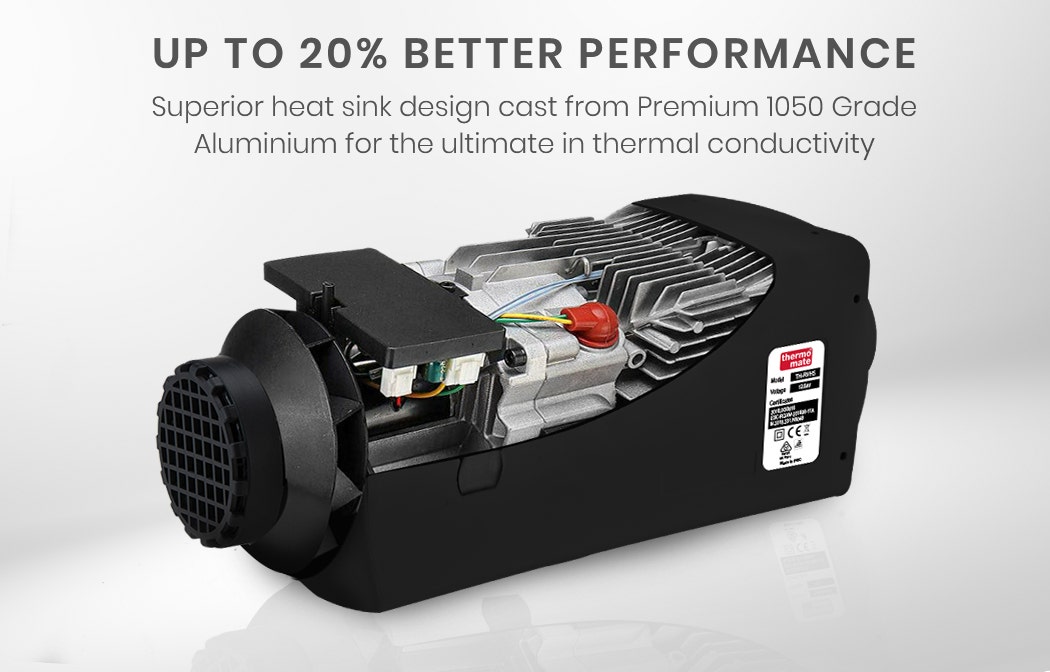 The Thermomate offers powerful, efficient performance thanks to a unique heatsink design that is cast from premium 1050 grade aluminum offering superior thermal conductivity. Whether you’re in a caravan, motorhome, camper trailer, truck or boat your space will be toasty in no time, and any frost on windows will quickly disappear. Once the target temperature is reached, the Thermomate is surprisingly quiet, so you’ll have happy campers and everyone will enjoy a good night’s sleep.