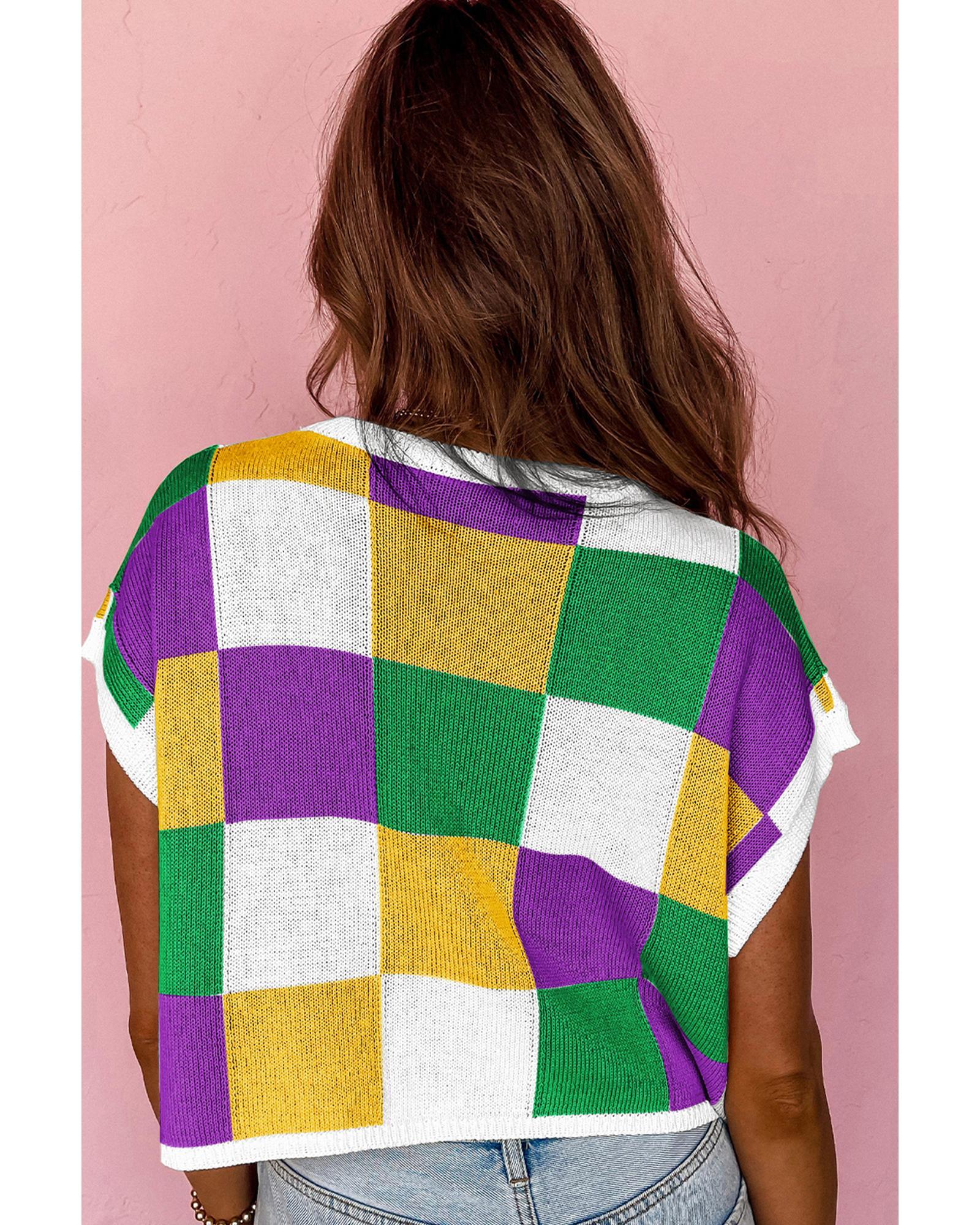 Tillandsia Purple Sequin Mardi Gras Fleur de Lis Color Block Sweater T Shirt – L