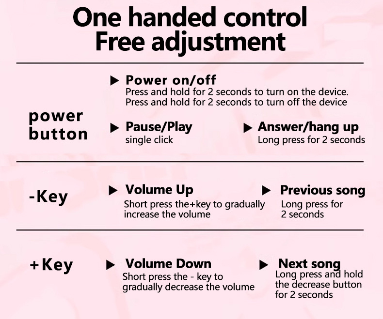 • Easy One-Handed Controls: Intuitive buttons for power, play/pause, answer/hang up, volume up/down, and previous/next song.