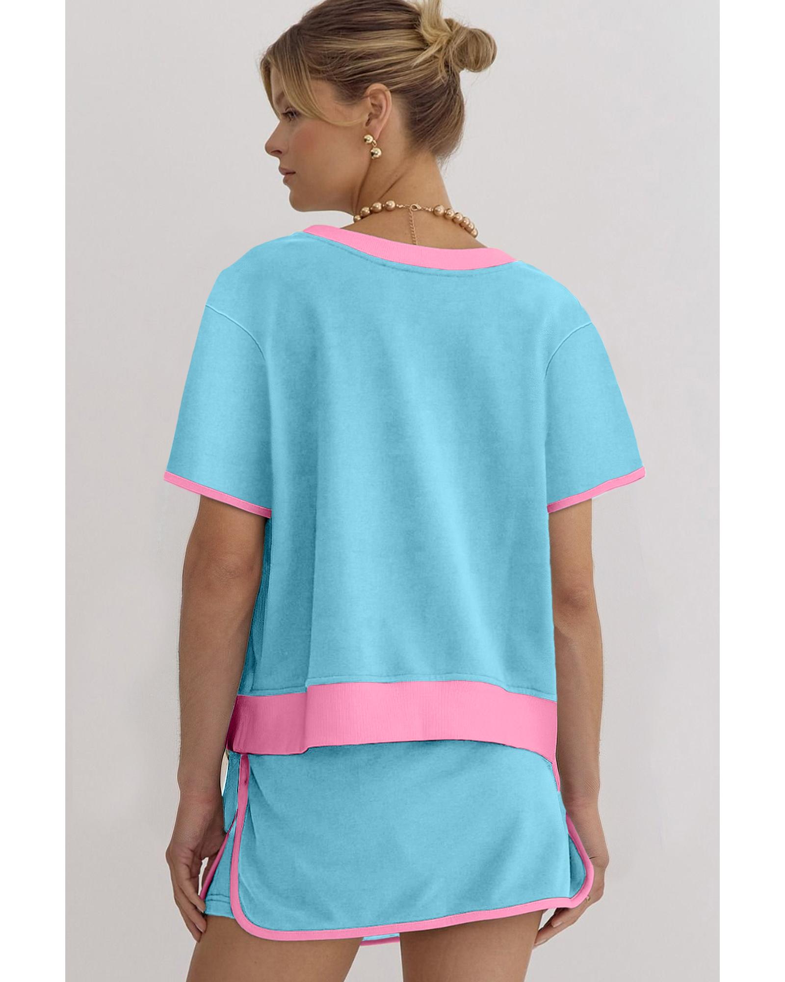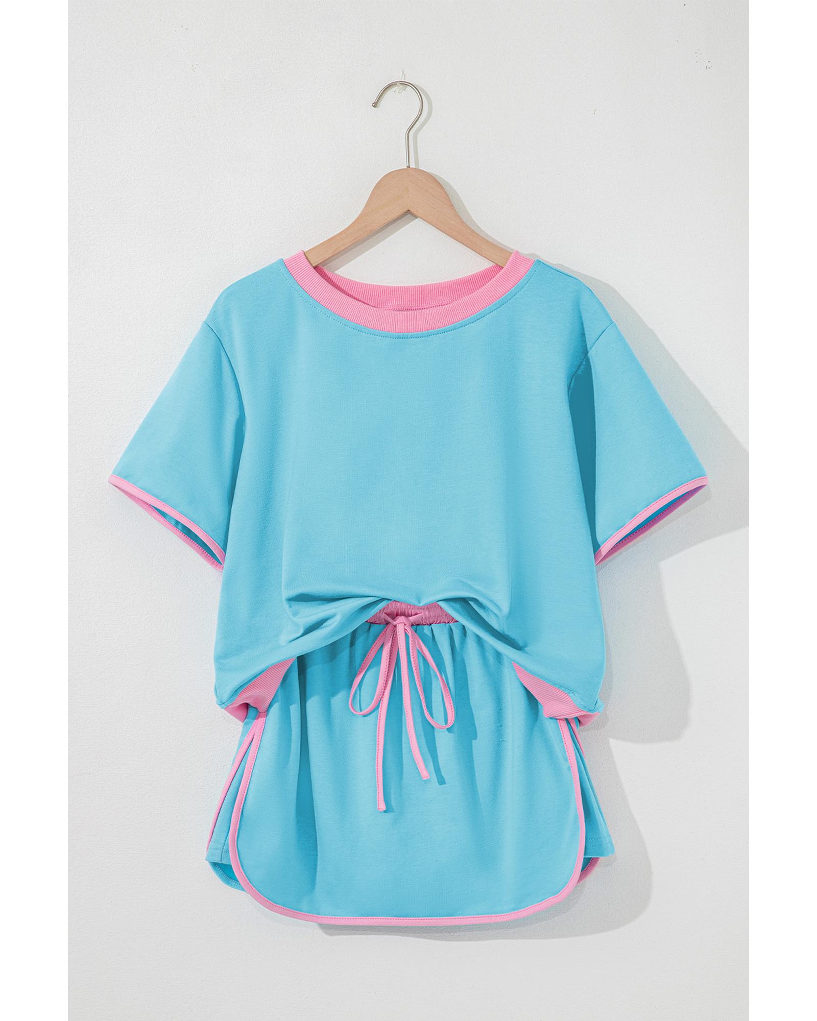 Turquoise Colorblock Edge Drop Shoulder T Shirt and Skirt 2Pcs Set – L