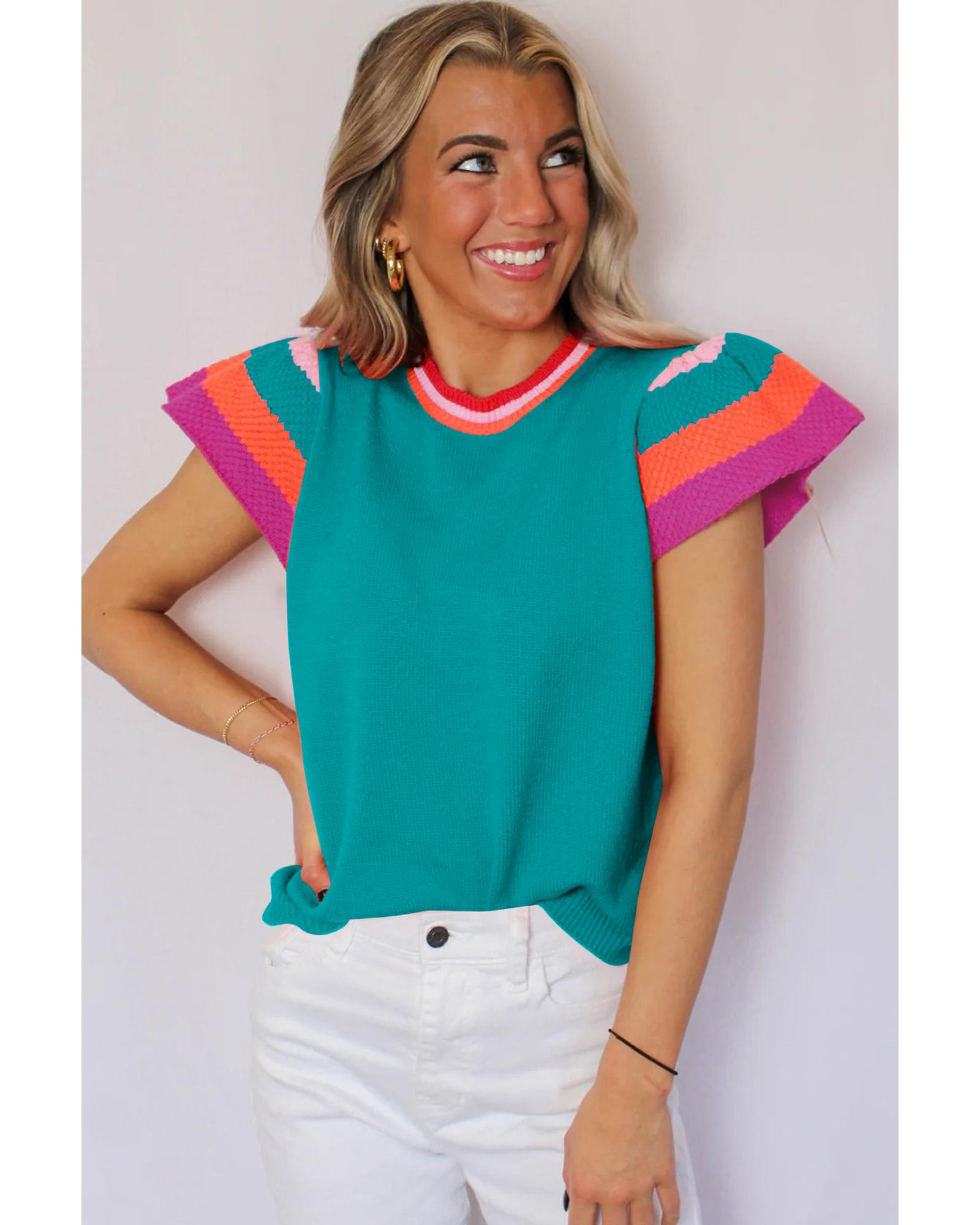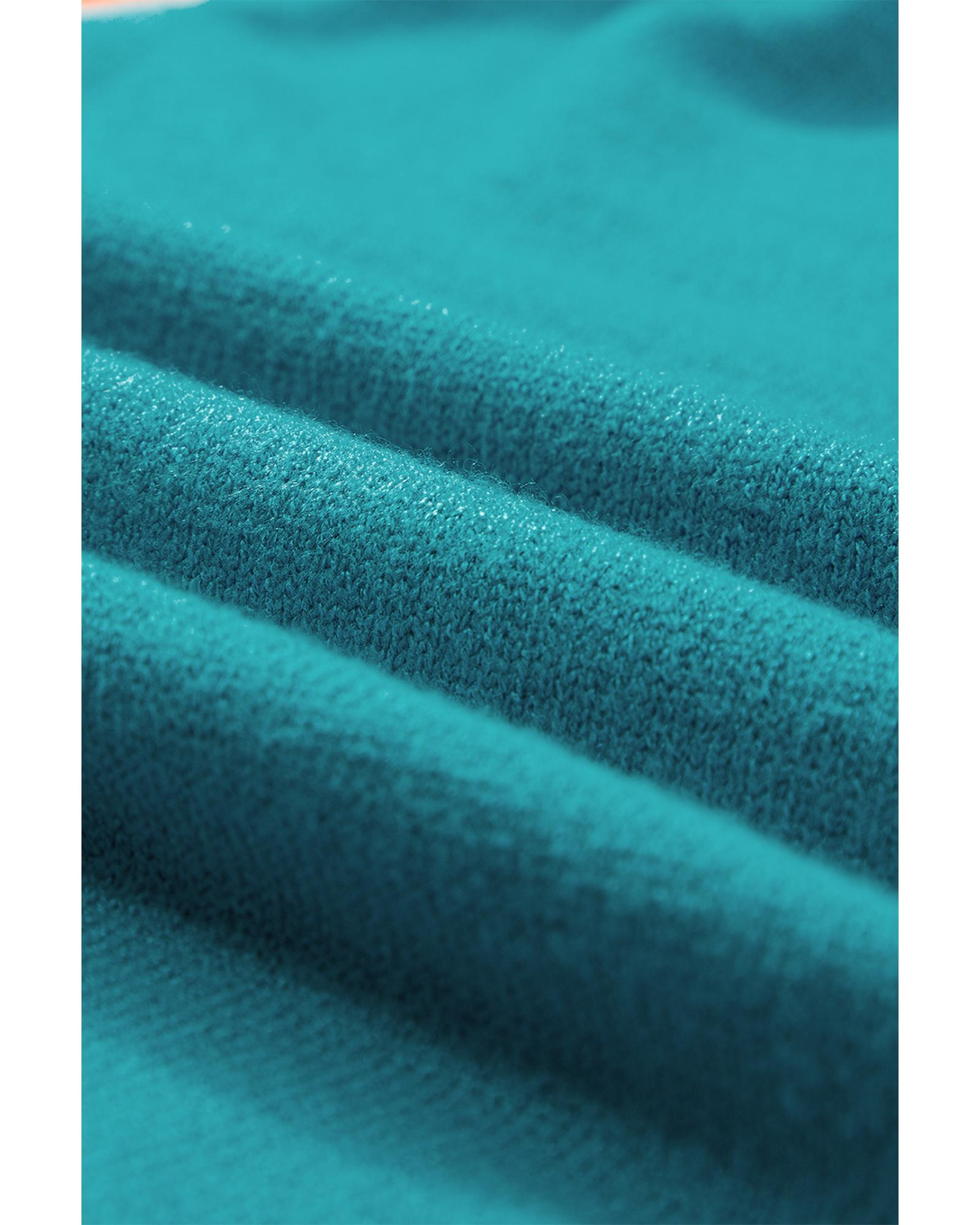 Turquoise Contrast Flutter Sleeves Knitted Sweater T Shirt – L