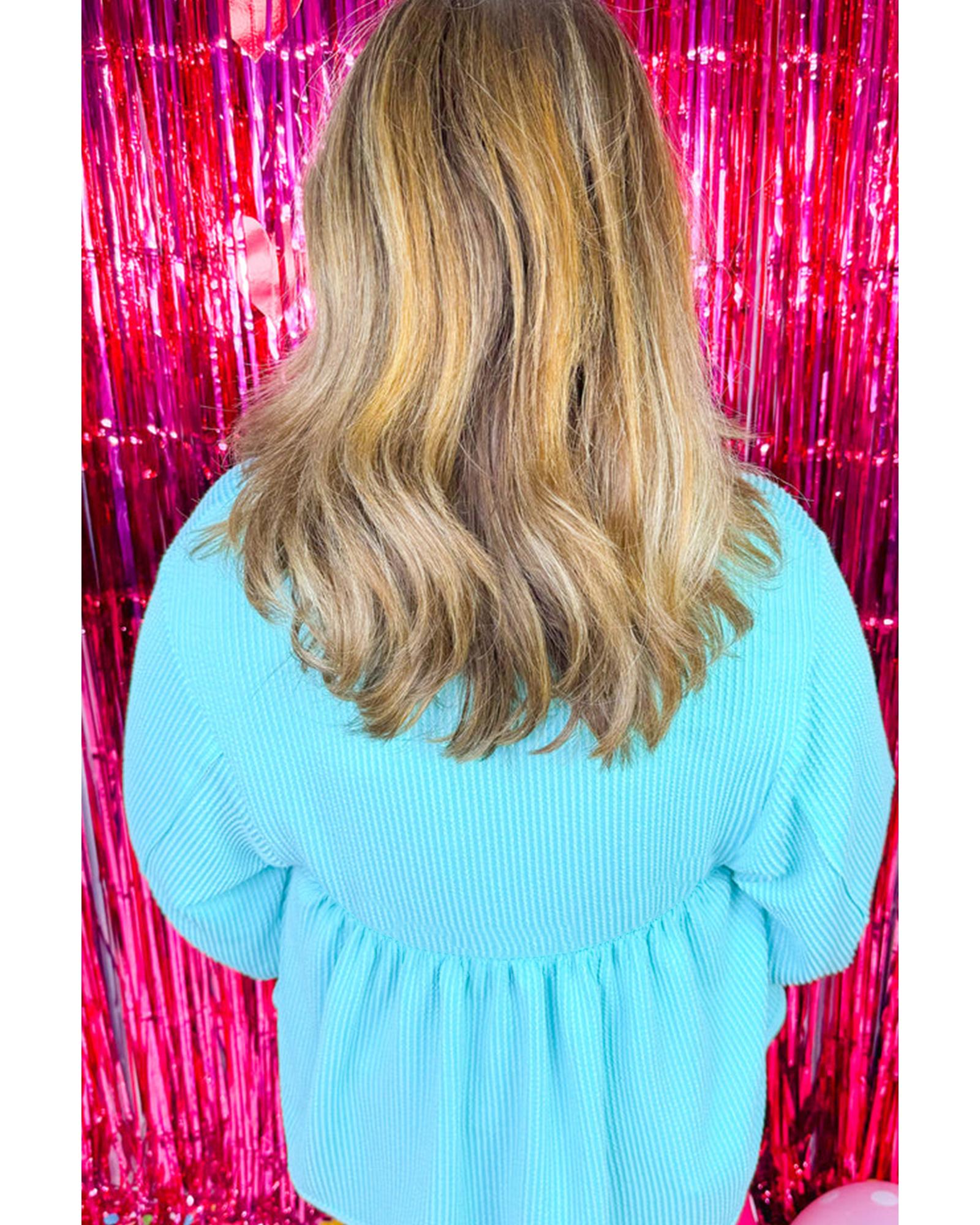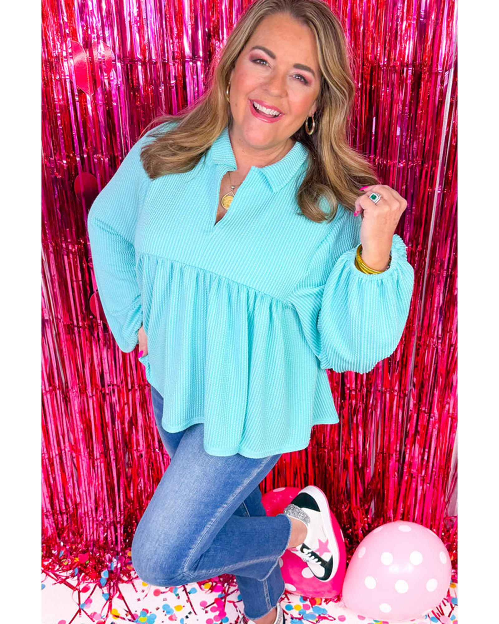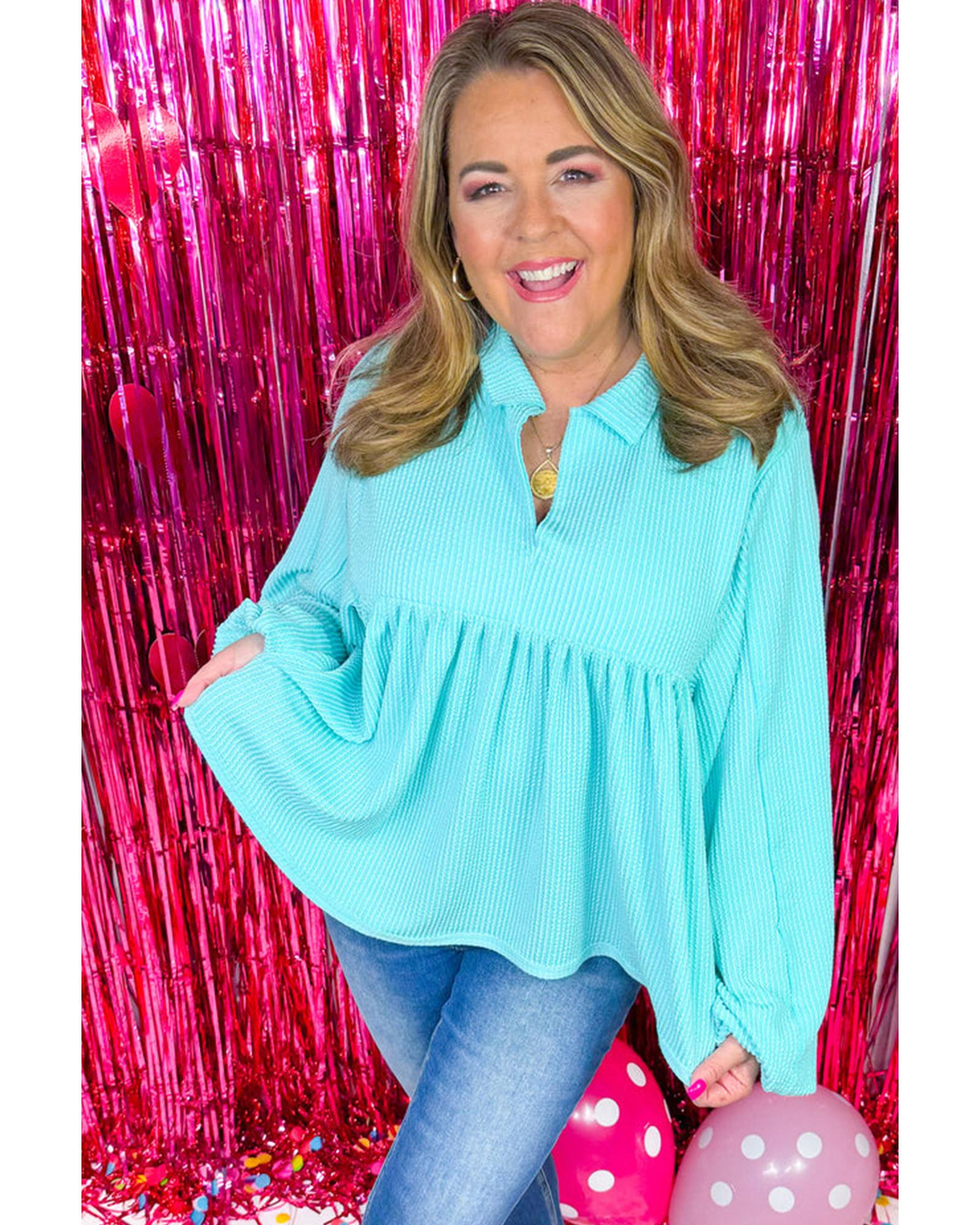 Turquoise Cordrd Balloon Sleeve Collar Plus Babydoll Top – 1X