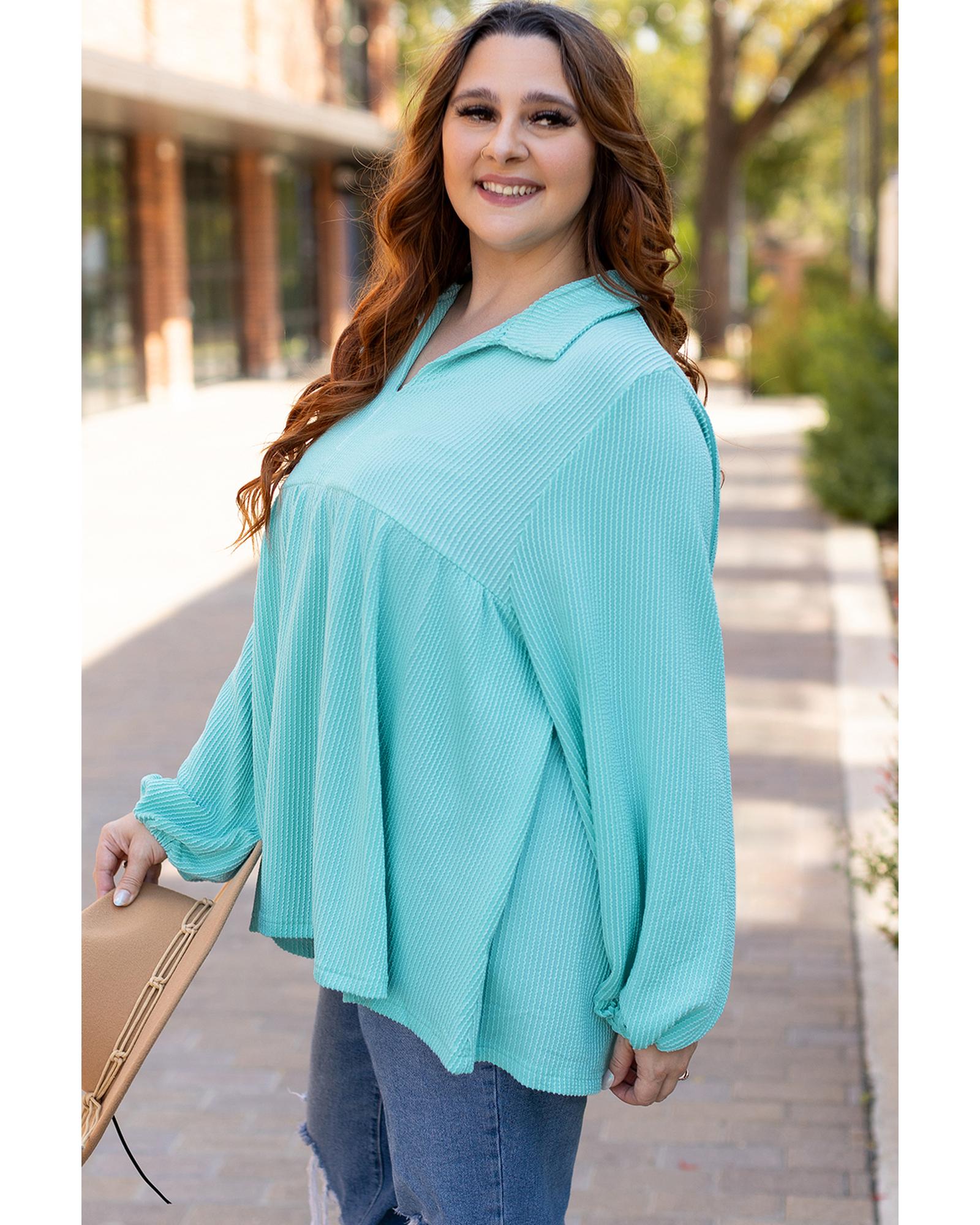 Turquoise Cordrd Balloon Sleeve Collar Plus Babydoll Top – 4X