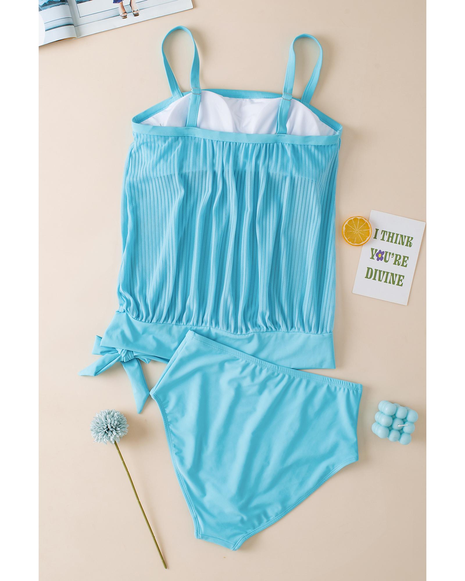 Turquoise Striped Mesh Knotted Hem Tankini Swimsuit – L