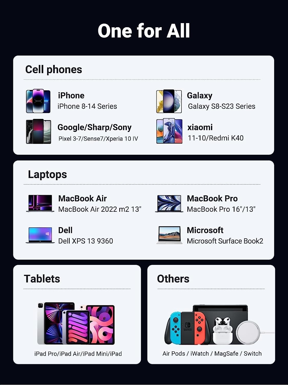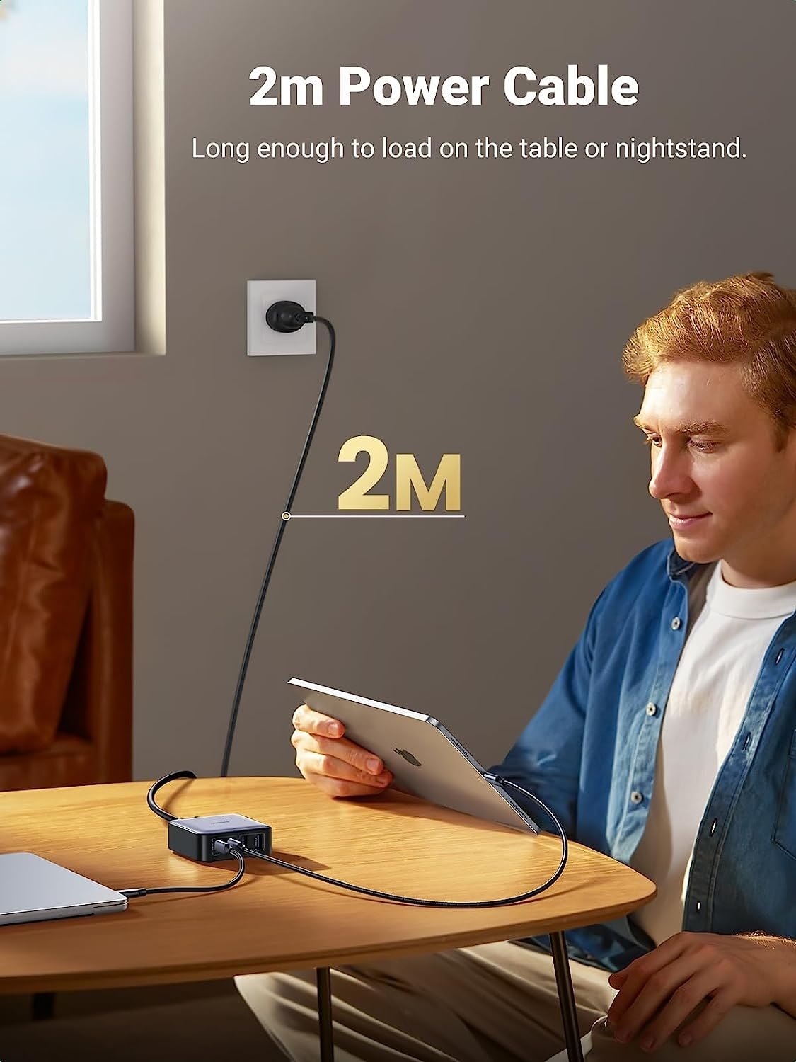 With 2 USB-C ports and 2 USB-A ports, this UGREEN charging station supplies up to 65W of power to phones, tablets, laptops, and more! All at the same time.
