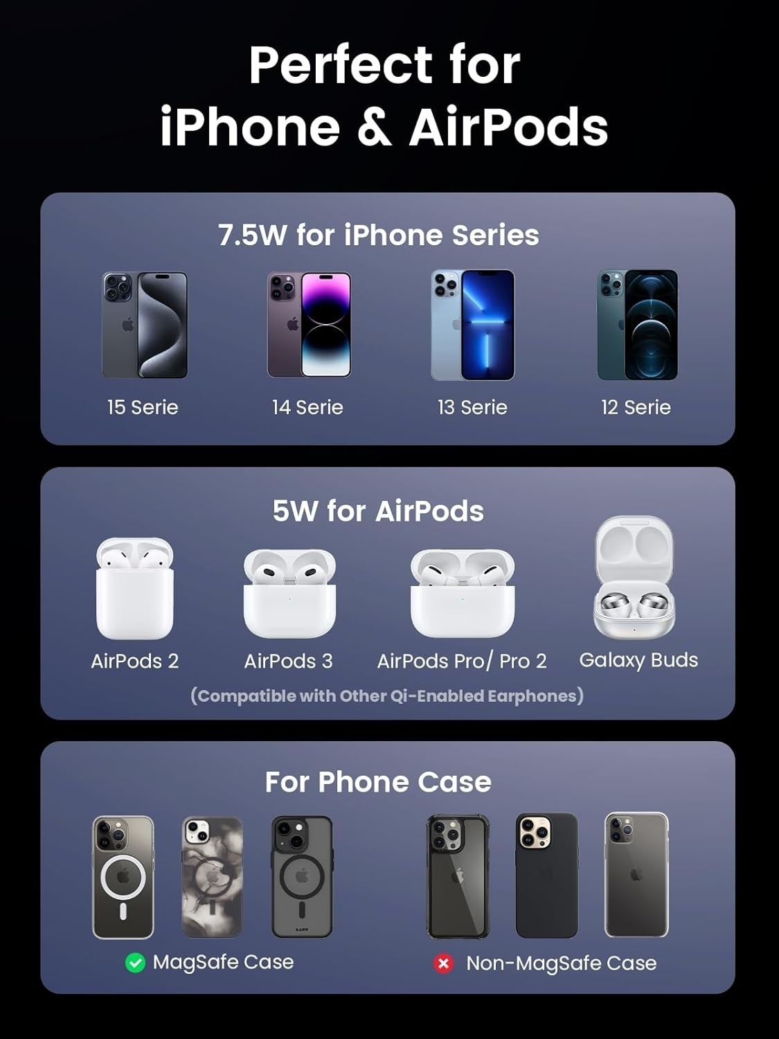 The wireless charging station for multiple devices is compatible with iPhone 15/15 Pro/15 Pro Max/14/13/12 series (7.5W for iPhone Series), AirPods Pro 2/1, AirPods3/2, Galaxy Buds, and most Qi-supporting devices. NOTE: For better charging, it is recommended to use a MagSafe phone case or a bare phone; Airpods 1 is not supported. For other types of Airpods, please ensure that it has the wireless charging case instead of the lightning case.