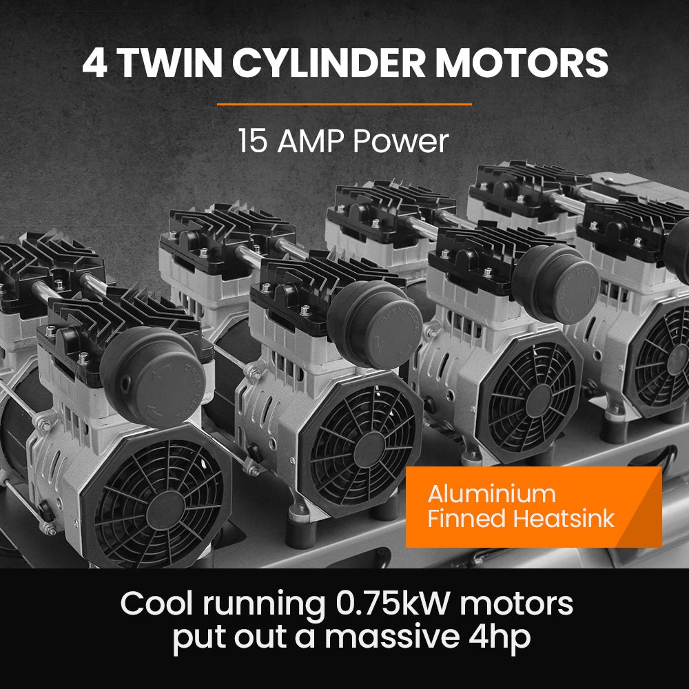 Unimac 150L 4.5HP Ultra-Slient Oil-Free Electric Air Compressor, Long Life Quad Motor, 116PSI Portable Heavy Duty, Twin Nitto Outlets, 15A Plug