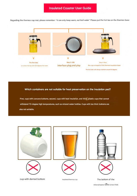 • Constant Temperature Maintenance: Keeps your hot beverage warm (around 55℃), preventing it from cooling down. Please note: This device is designed to keep warm drinks warm, not to heat cold drinks quickly or boil water.