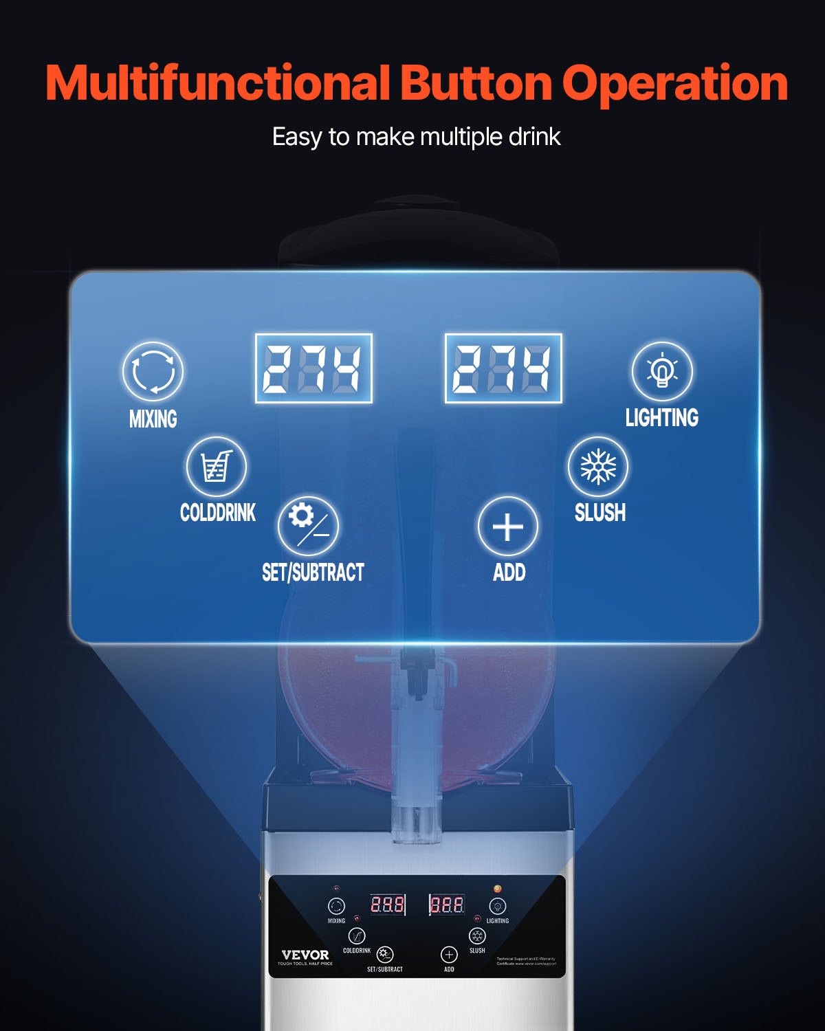 The user-friendly control panel allows for easy operation, including two mode settings (slushy and cold drink), automatic cleaning, temperature control, and time settings. The temperature is clearly displayed on the digital screen, making it easy to monitor at any time.