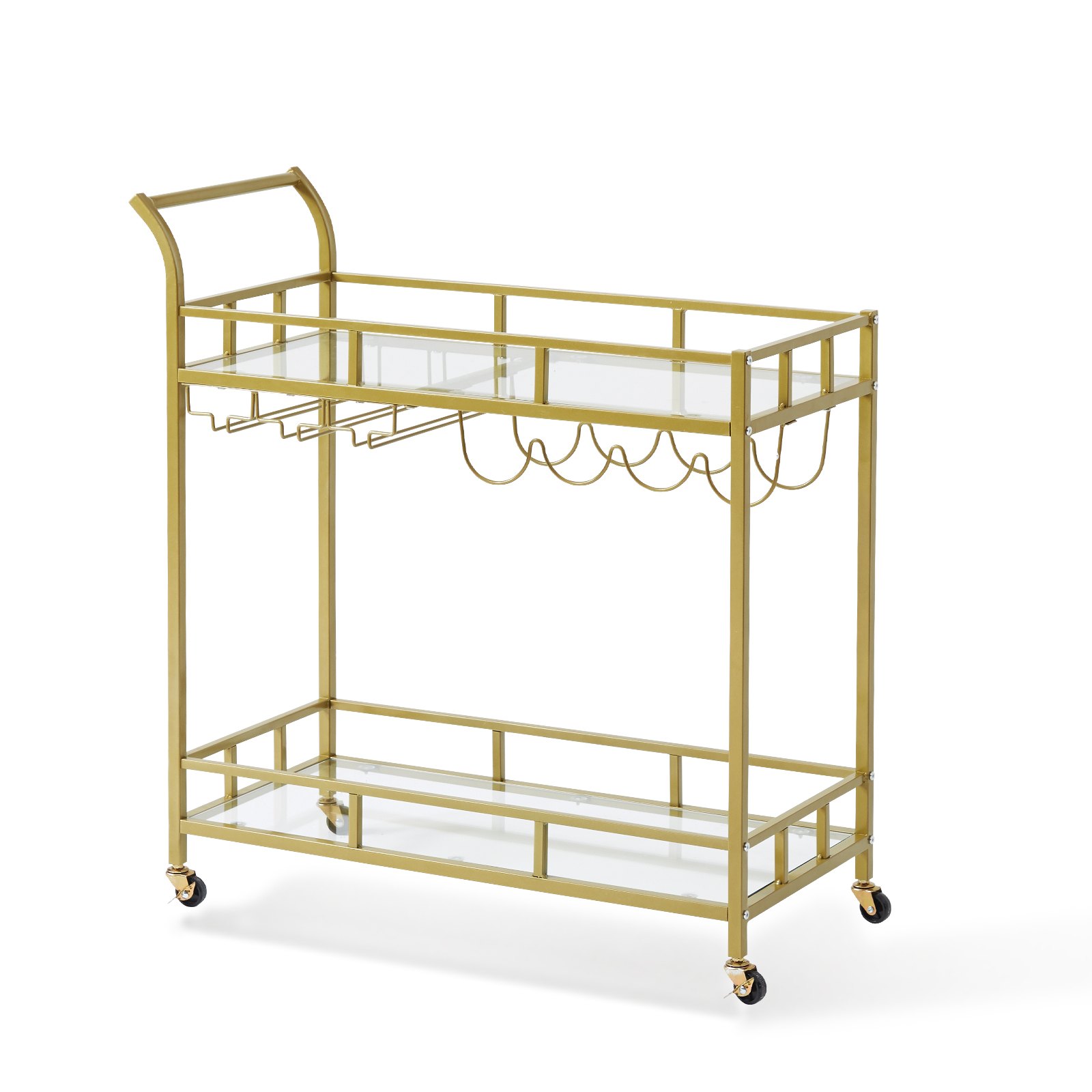 Stop and move seamlessly! Features four 360�� swivel casters and two casters with brakes. The gold bar cart can be freely moved throughout your kitchen, dining room, or garden. It moves smoothly without noise. Roll it where your party needs it, or park it next to your sofa to serve coffee after the party.