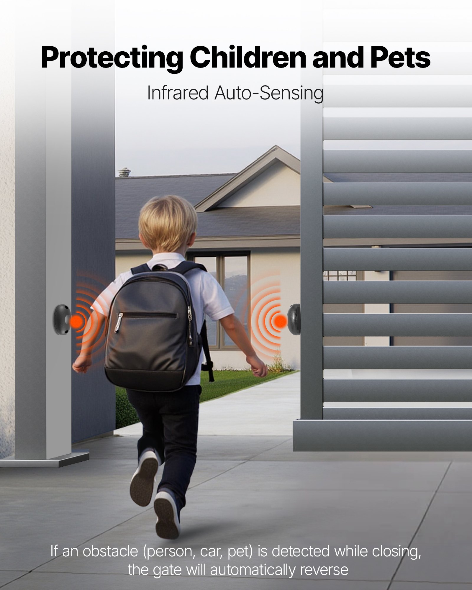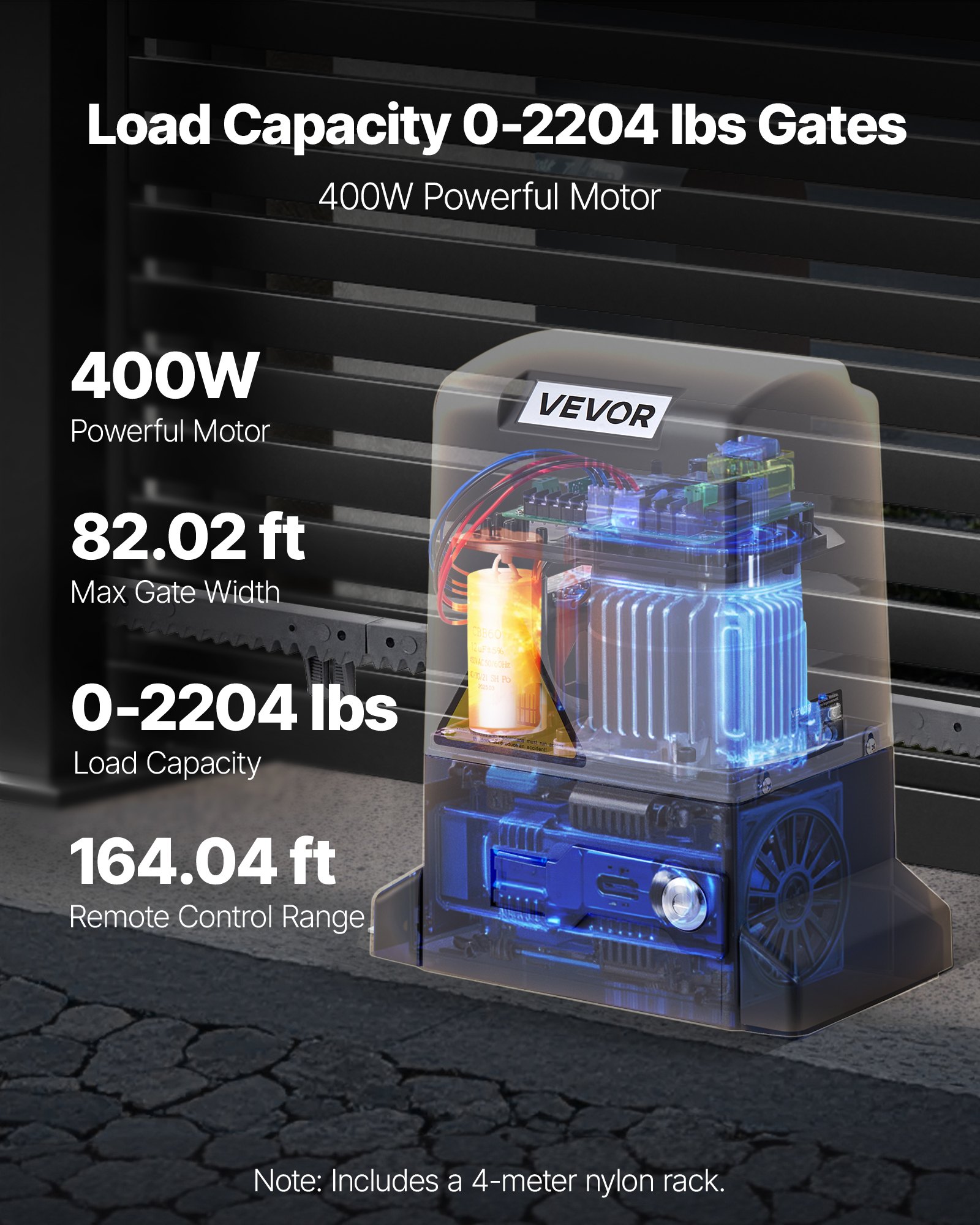With a 400W pure copper motor and 1400r/min speed, this automatic gate opener supports up to 2204 lbs /1000 kg gates (up to 82.02 ft / 25 m wide), ensuring smooth, reliable operation for residential, farm, or commercial use.