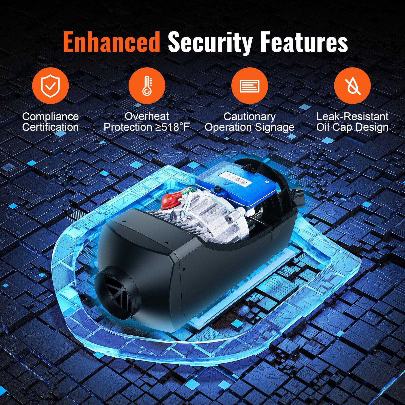 Our diesel air heater features a high safety system, allowing for worry-free usage in various environments such as cars, RVs, ships, and indoors. It provides constant temperature control, timing function, voice broadcasting, preheating, and overheating protection at ��270 ��C/518 ��F, ensuring a safe and comfortable experience throughout the night.