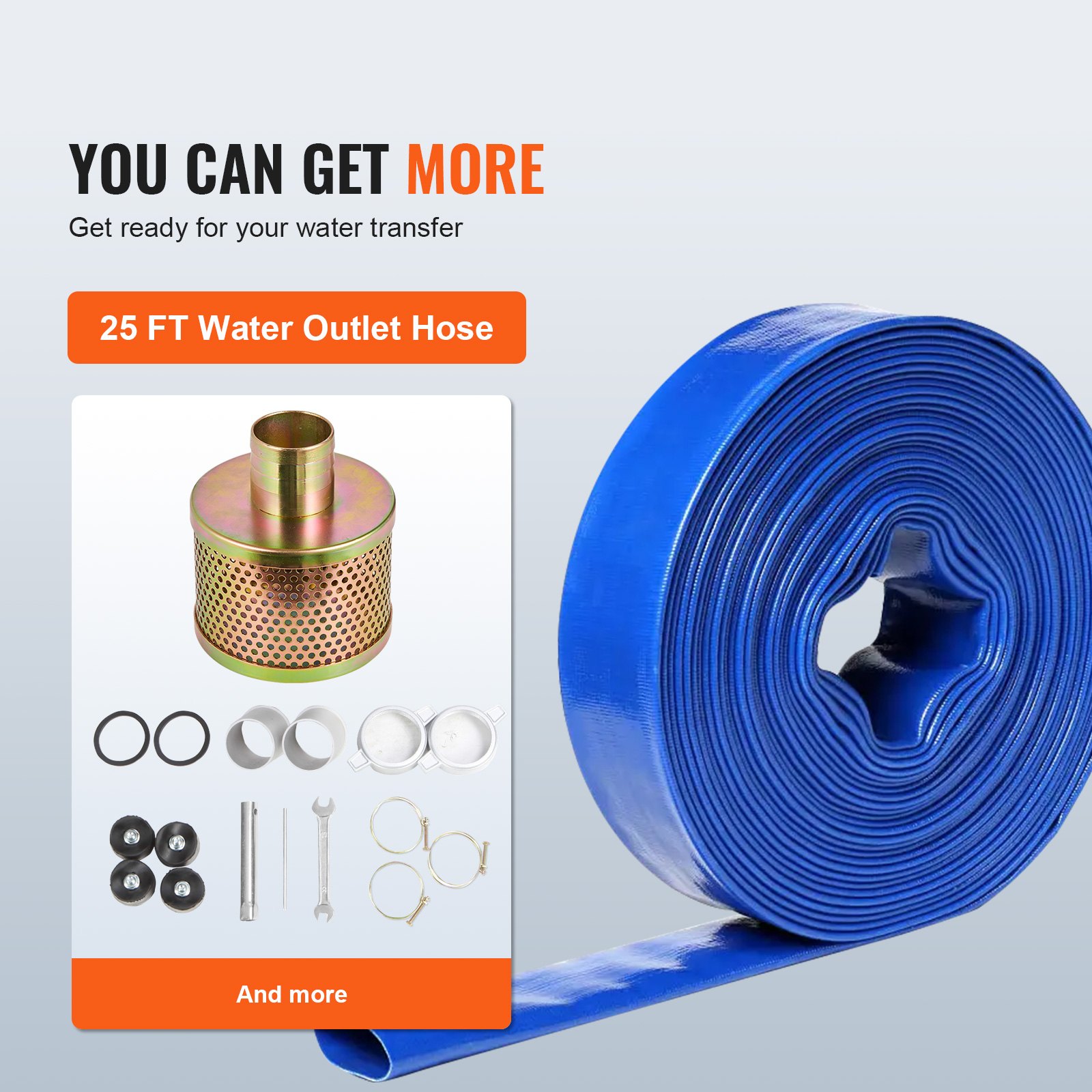 This gas engine water transfer pump comes with everything you need to get started – including a 25 ft outlet hose, inlet metal filter screen, spark plug sleeve, forcing rod, wrench pressure cap, pipe joints, sealing rings, shock pads, etc. You’ll be up and running in no time!