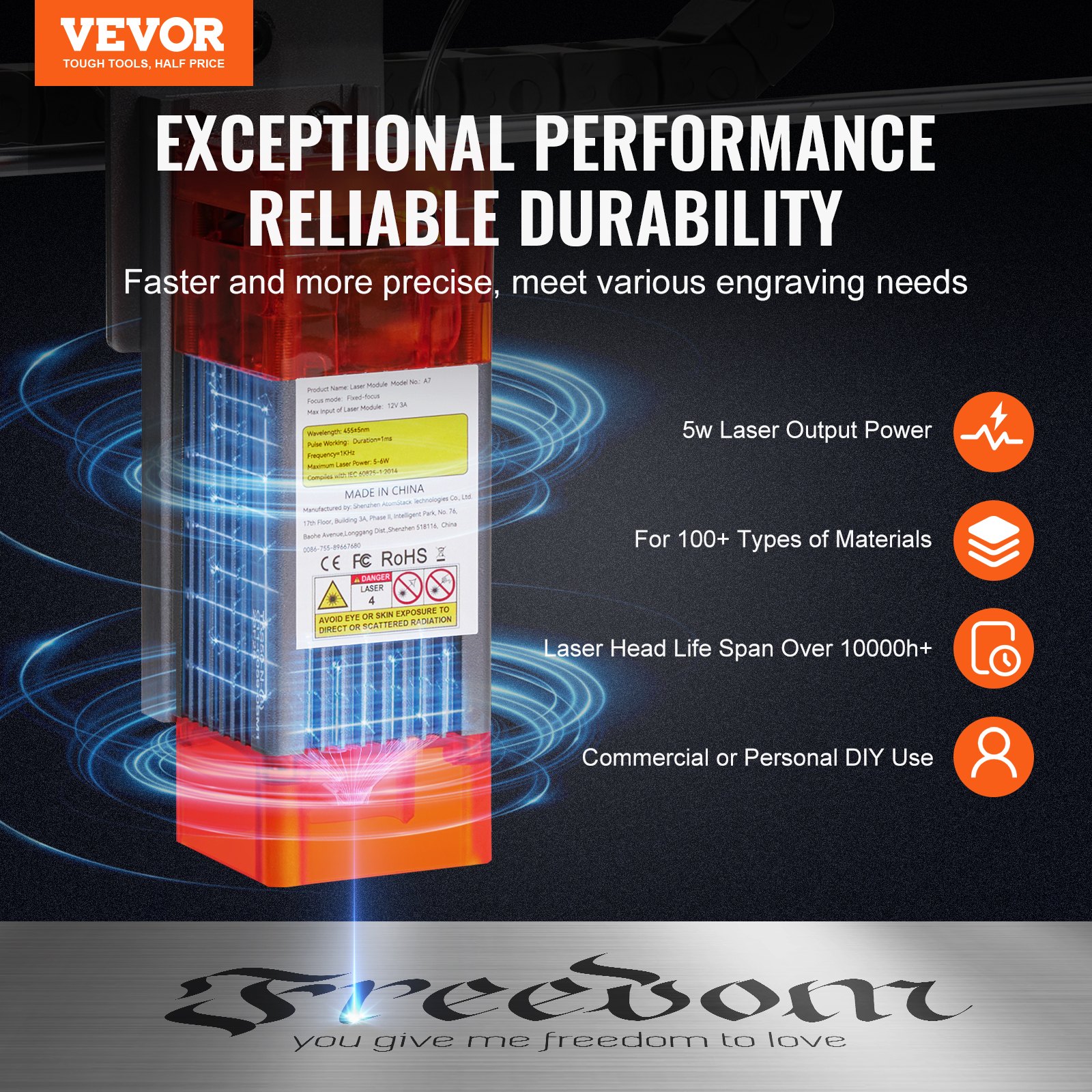 Experience exceptional performance with our laser engraver. With 5W laser power, it effortlessly engraves and cuts over 100 types of materials. Enjoy cutting-edge features like a laser head lifespan of over 10,000 hours(at 80% power) and a spacious 410x400mm engraving area. Perfect for both commercial and personal DIY use.