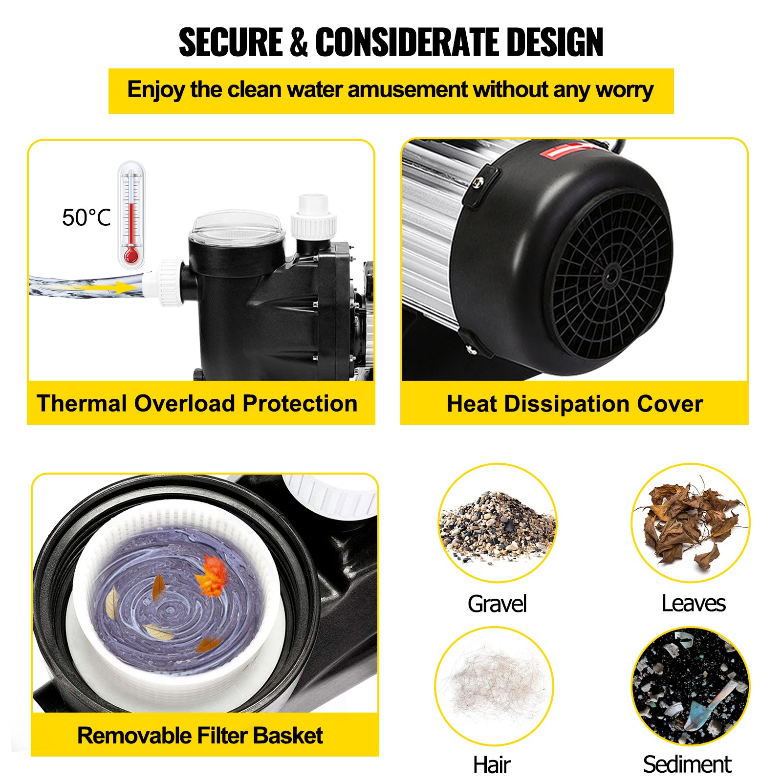 The pool pump adopts an S-Tek flow system with a maximum head lift of 62.34 ft and a maximum flow rate of 560 L/min. In addition, the filter basket in the pump can effectively filter debris in the water to provide clean water, such as hair, leaves, gravels, etc.