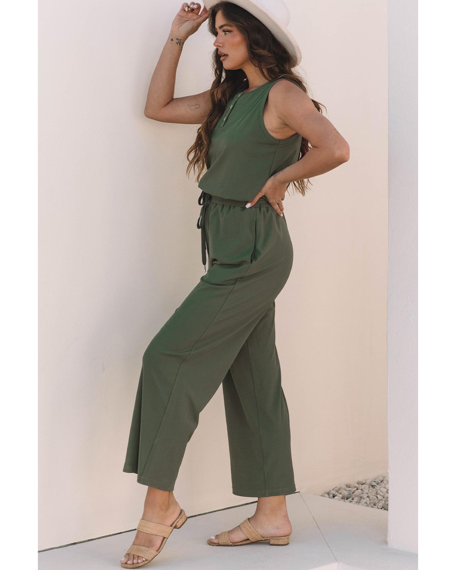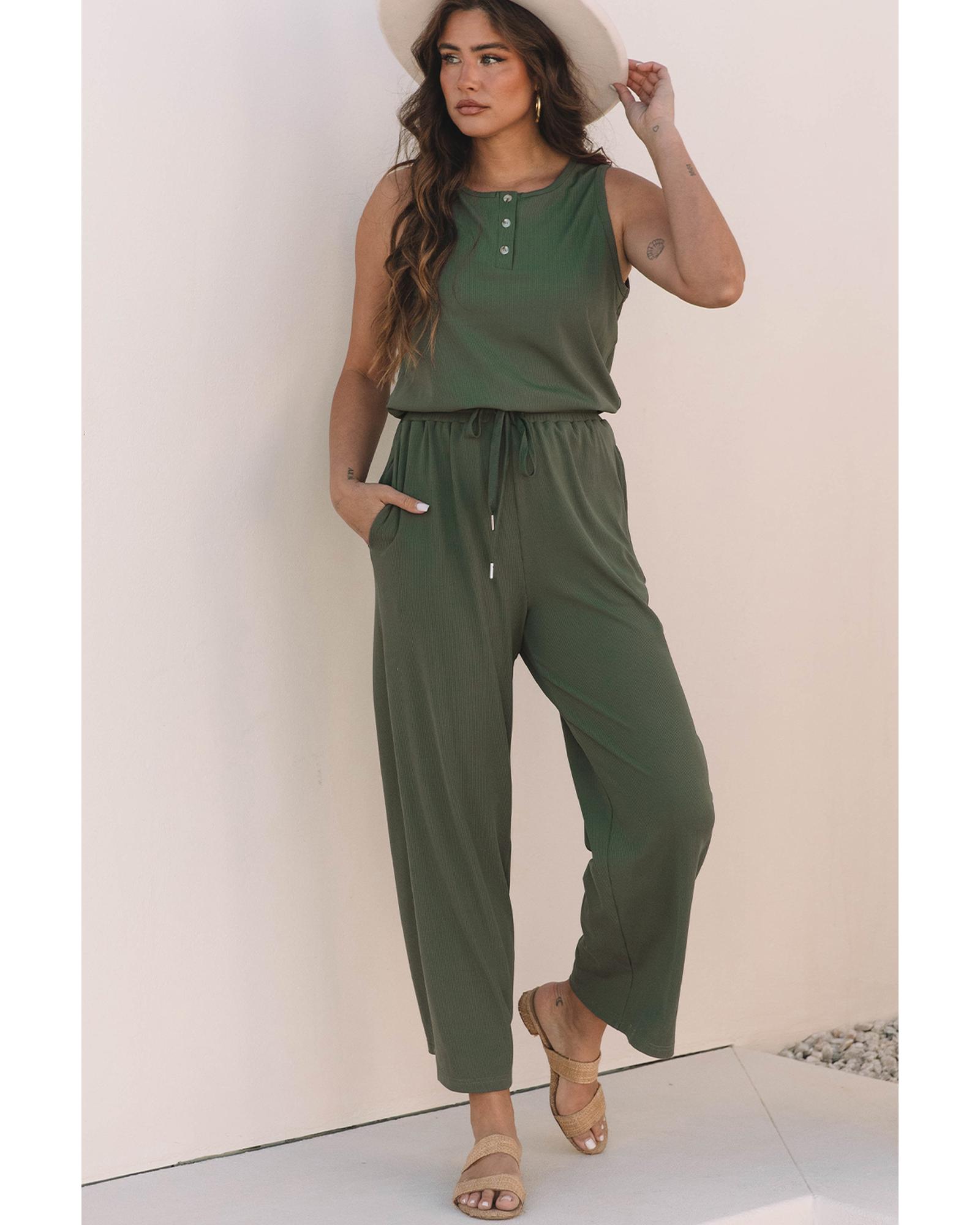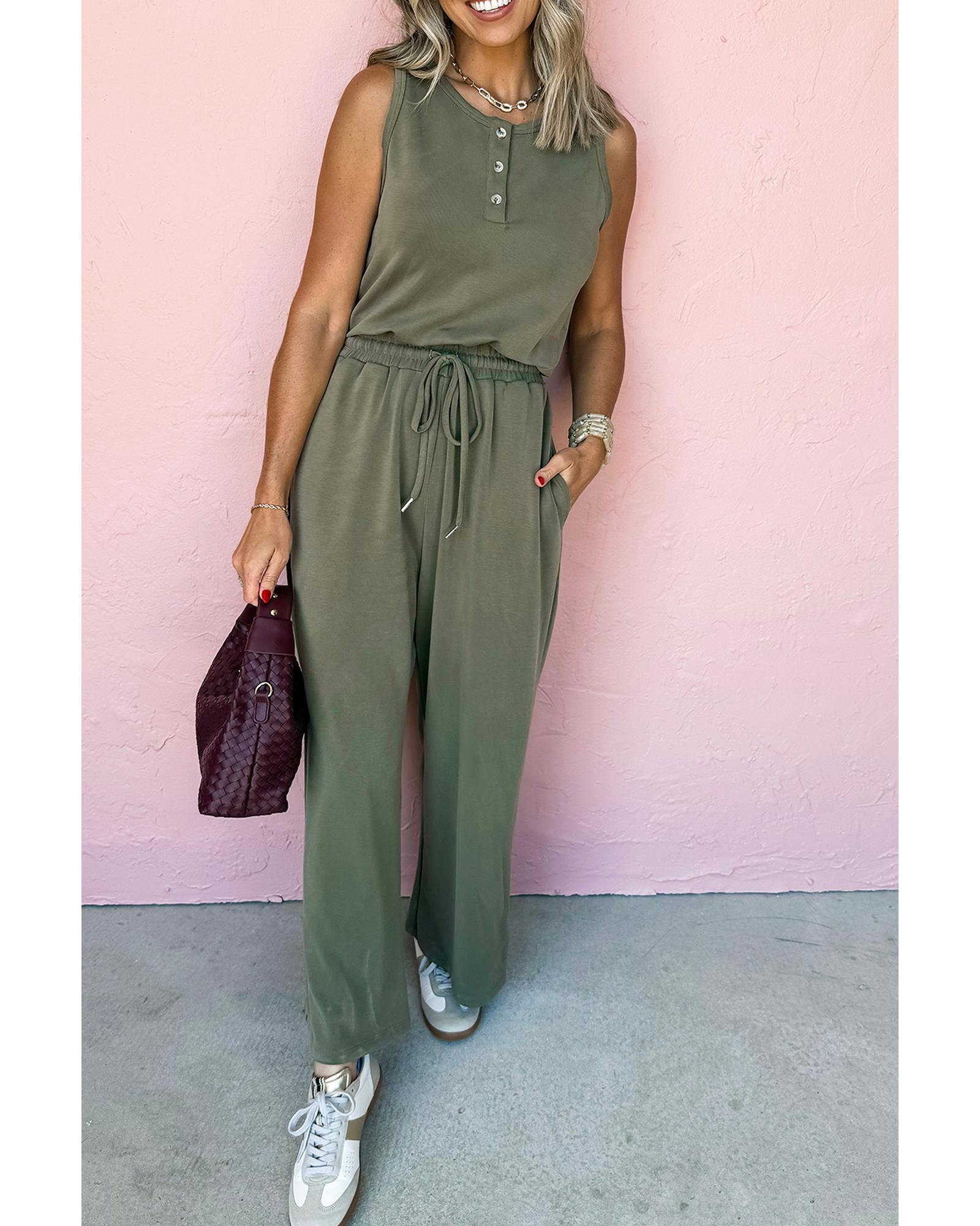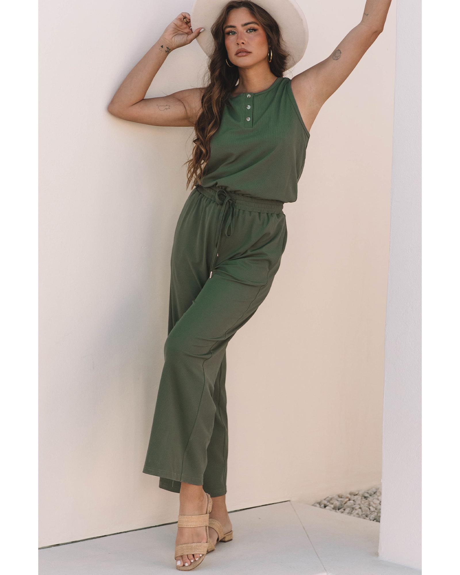 Vineyard Green Buttoned Drawstring Waist Sleeveless Wide Leg Jumpsuit - XL