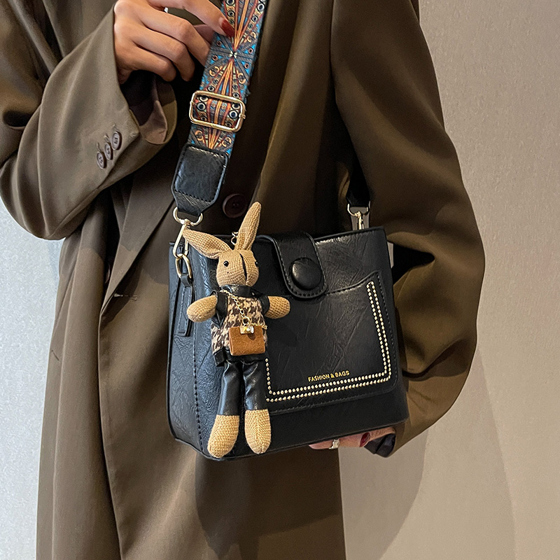 Add a touch of retro charm to your ensemble with this stylish Vintage Style PU Leather Bucket Bag. Crafted from quality PU material, this bag features a unique textured finish, complemented by stud detailing on the front pocket and a secure magnetic snap closure. It comes with a distinctive wide, patterned shoulder strap that adds a bohemian flair and ensures comfortable carrying. The compact yet practical size (20cm W x 18cm H x 11cm D) is perfect for your daily essentials. For an extra touch of personality, an optional adorable bunny rabbit charm, dressed in a chic outfit with a tiny handbag, can be chosen to accompany the bag. This bucket bag is a fashionable choice for various occasions, blending vintage aesthetics with modern trends.