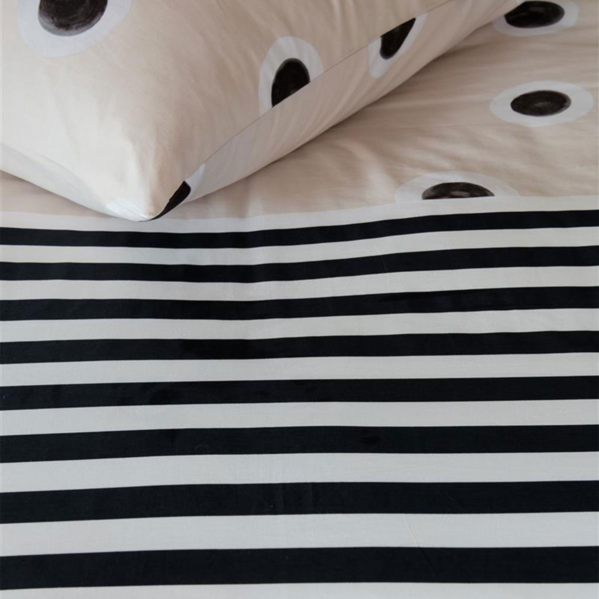 The Stripe and Eye Natural Cotton Quilt Cover Set by VTWonen has a print of dots and stripes. The top of the quilt cover features a print of hand-painted natural, black and white dots against a cream-coloured background. The underside of the duvet cover features print of horizontal black and white stripes. The front and back of the quilt cover are identical.