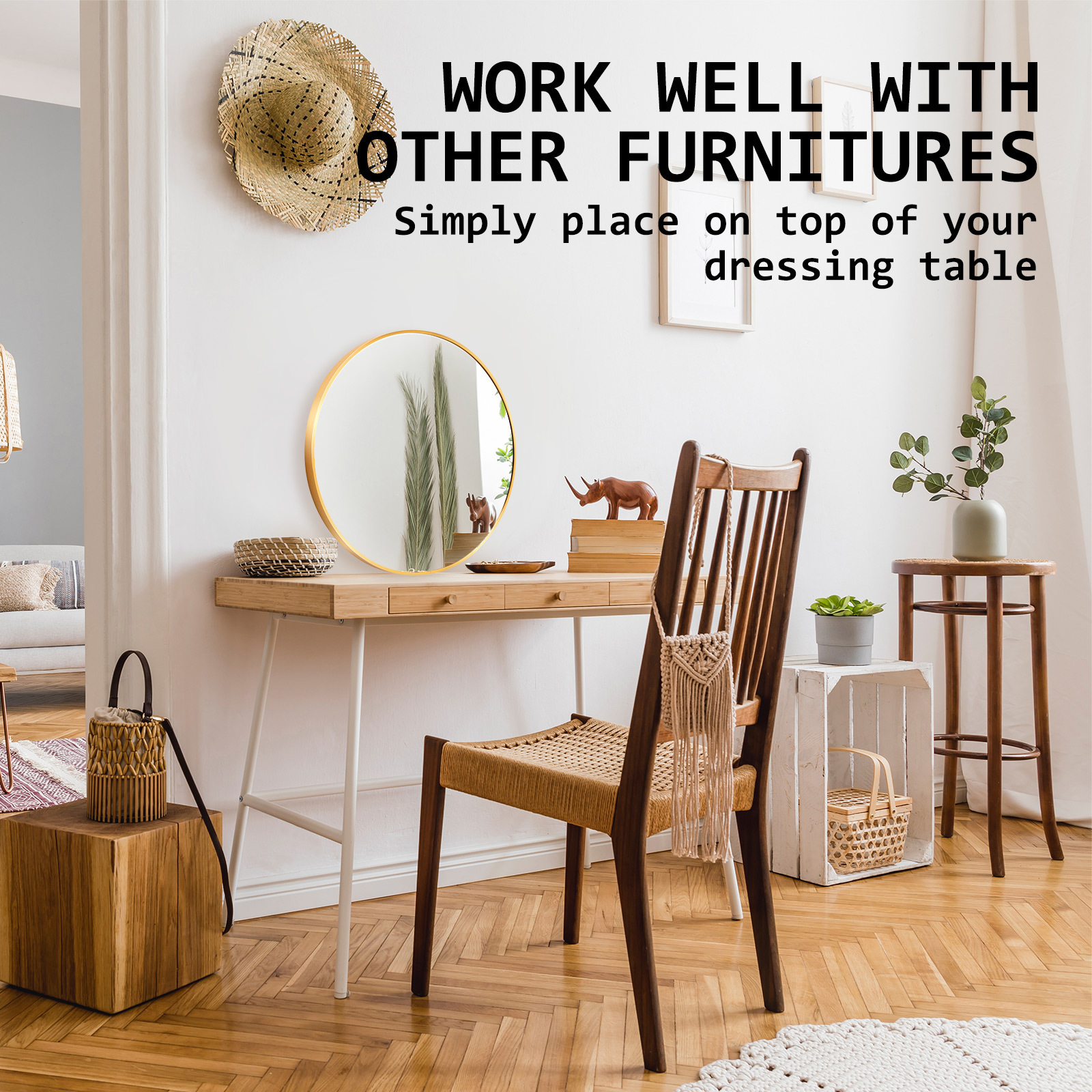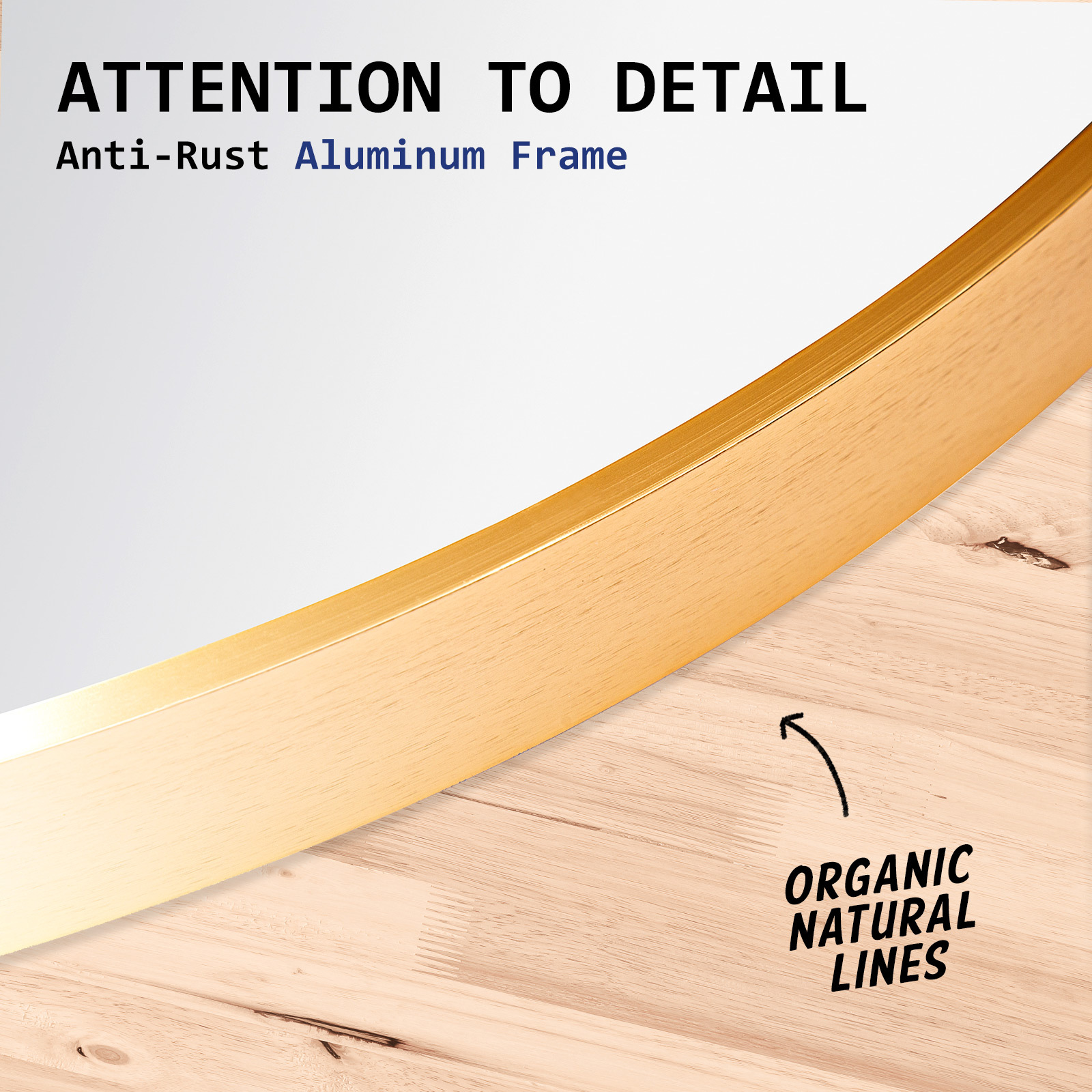 Please note it’s neither brass gold nor rose gold. Our aluminum mirror, part of the gold color theme, has a unique shade within the gold spectrum. The frame color may vary with light due to aluminum’s reflective nature.