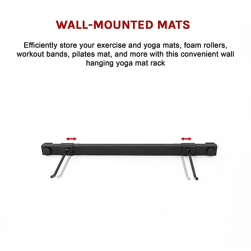 Efficiently store your exercise and yoga mats, foam rollers, workout bands, pilates mat, and more with this convenient wall hanging yoga mat rack. Keep all your essential gear within easy reach and neatly organized.