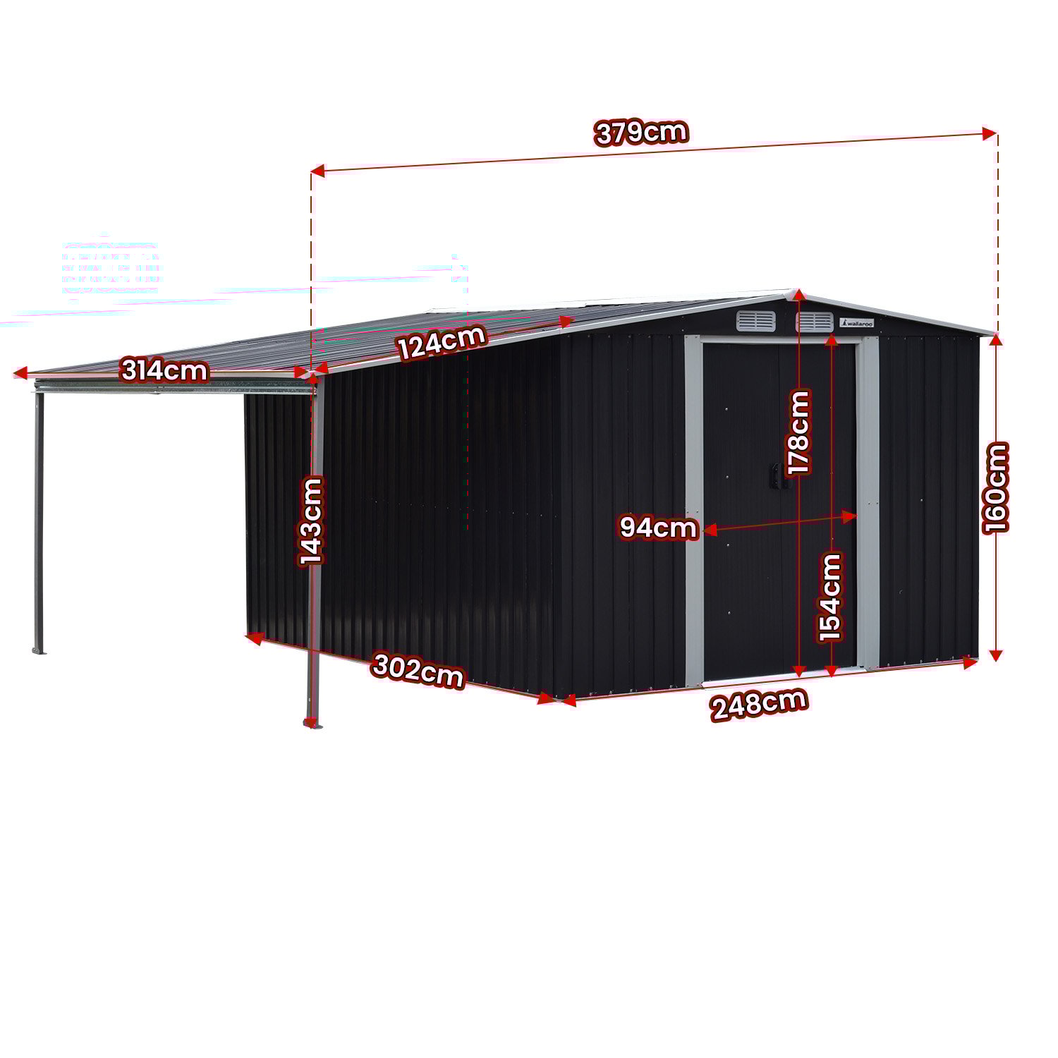 - Shed Dimensions (W x H x D): 257 x 178 x 302cm
