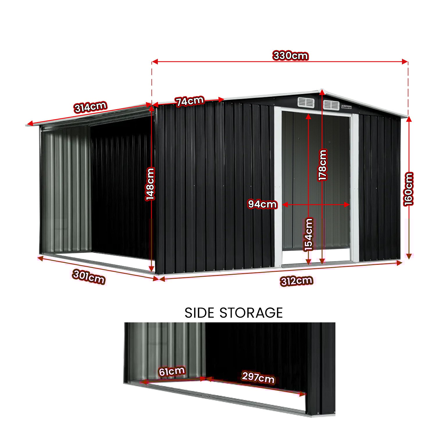 - Shed Dimensions (W x H x D): 257 x 178 x 312cm