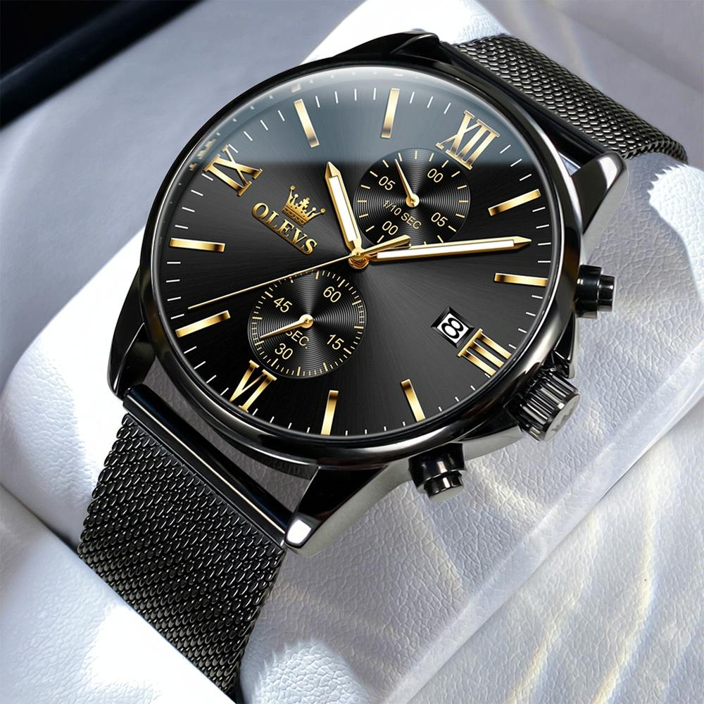 Waterproof Men Chronograph Quartz Watch with Luminous Dial – Black Gold Mesh Strip
