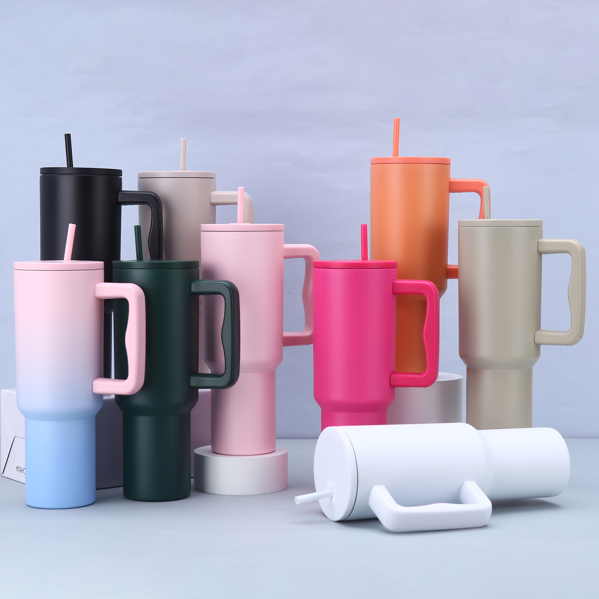 This massive 40oz tumbler combines superior insulation with car-friendly convenience. Featuring a comfortable handle and included straw, it keeps drinks cold for hours while being perfectly sized for your vehicle’s cup holders.