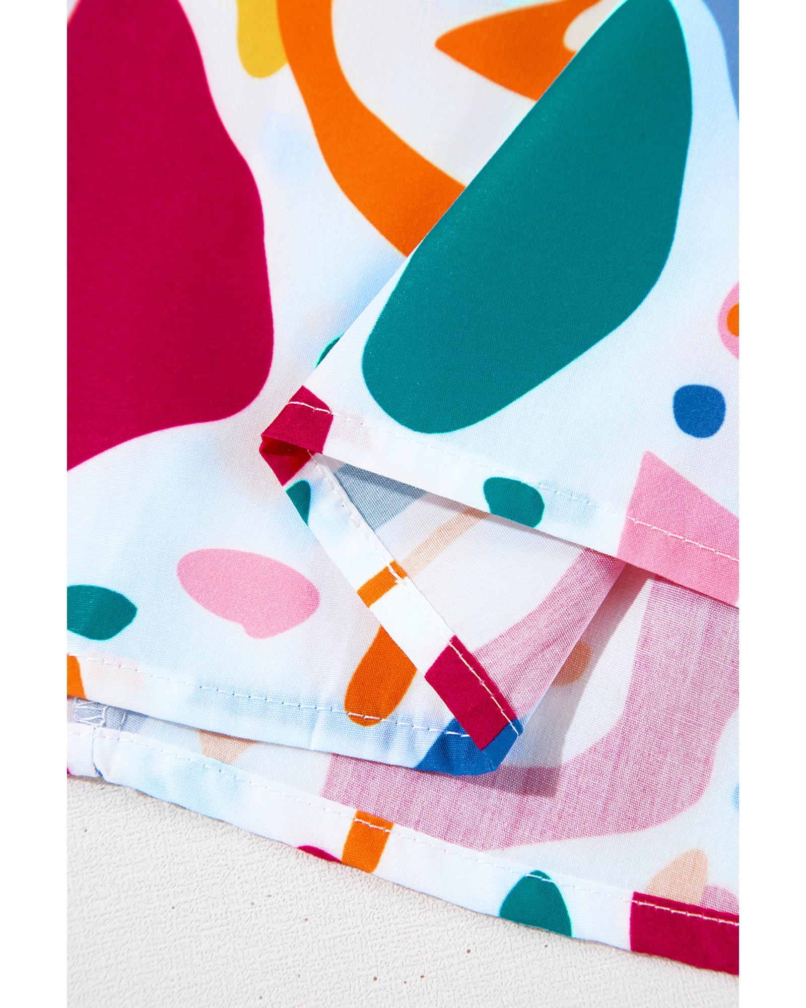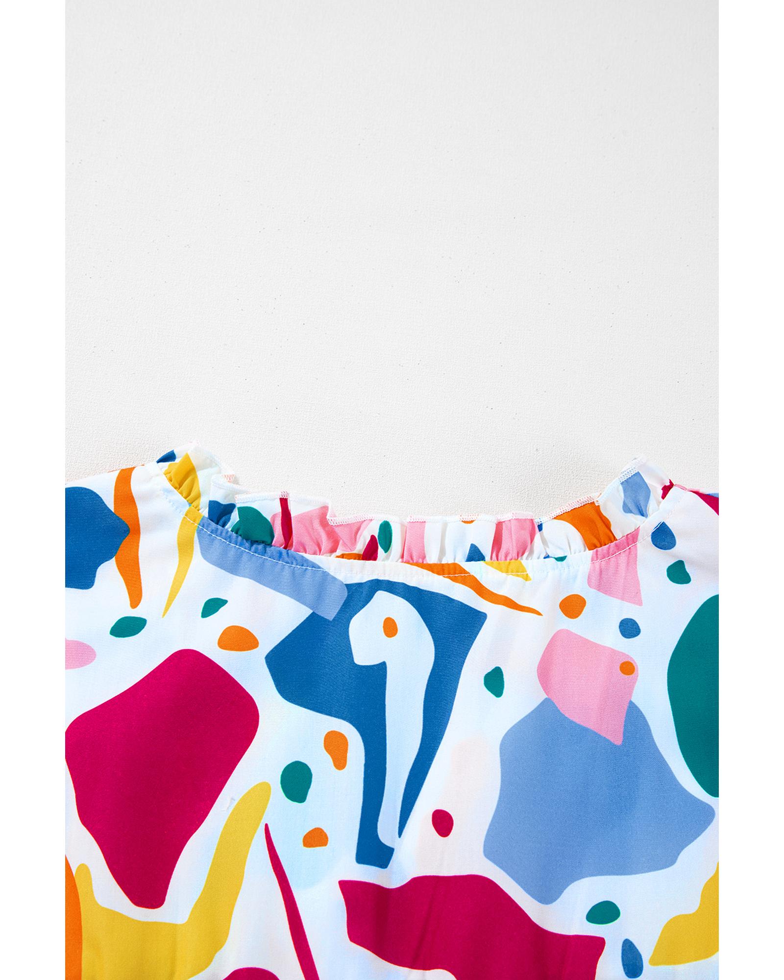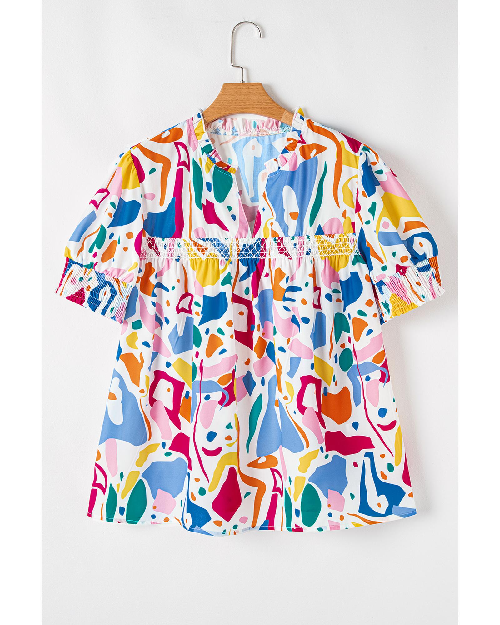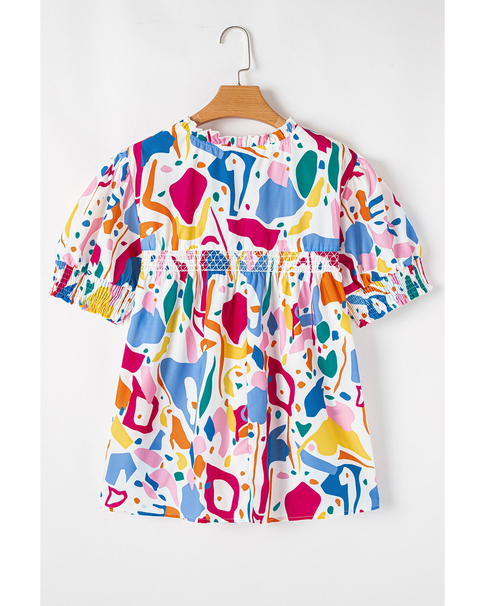 White Abstract Print Shirred Cuff Puff Sleeve Plus Size Blouse – 3X