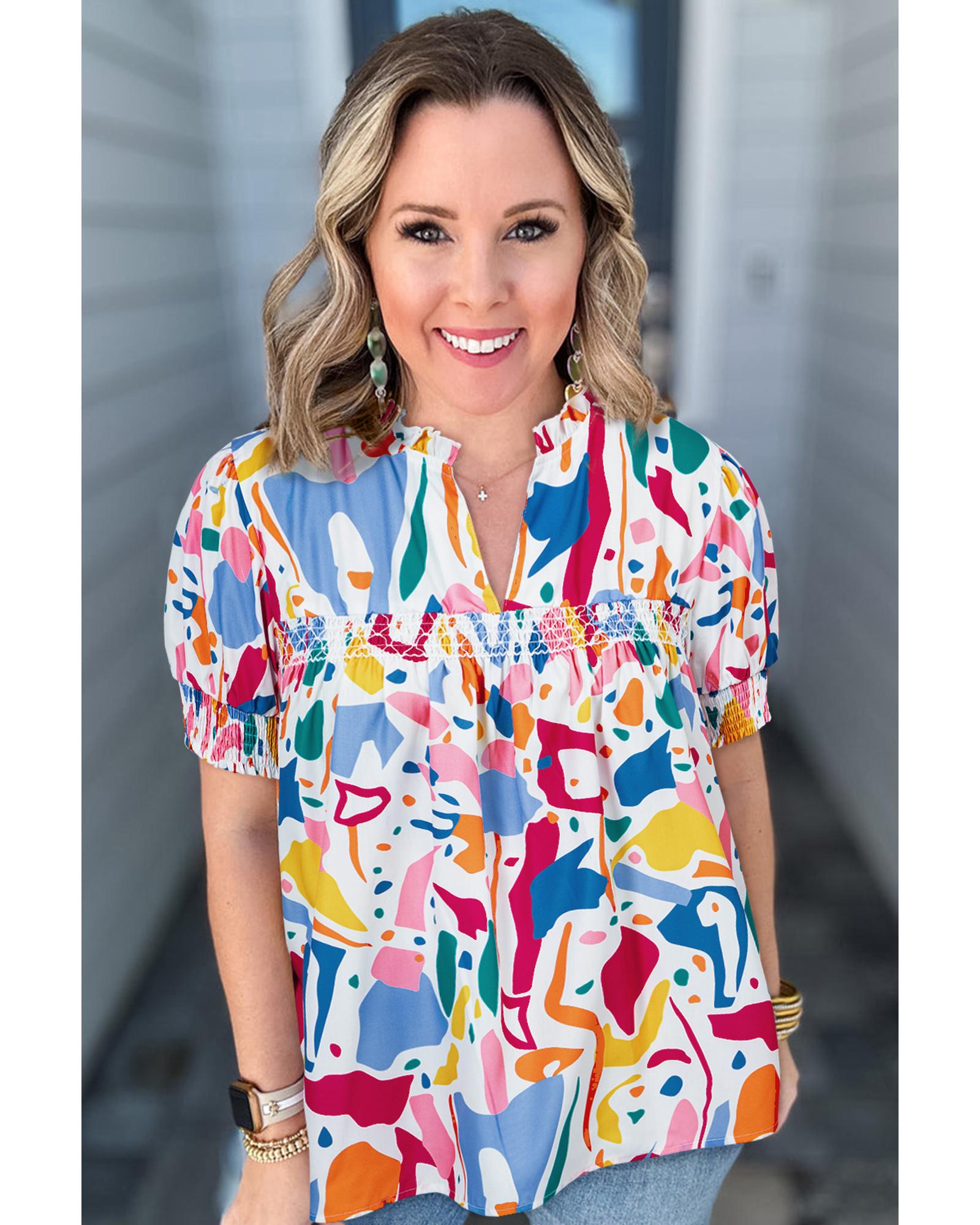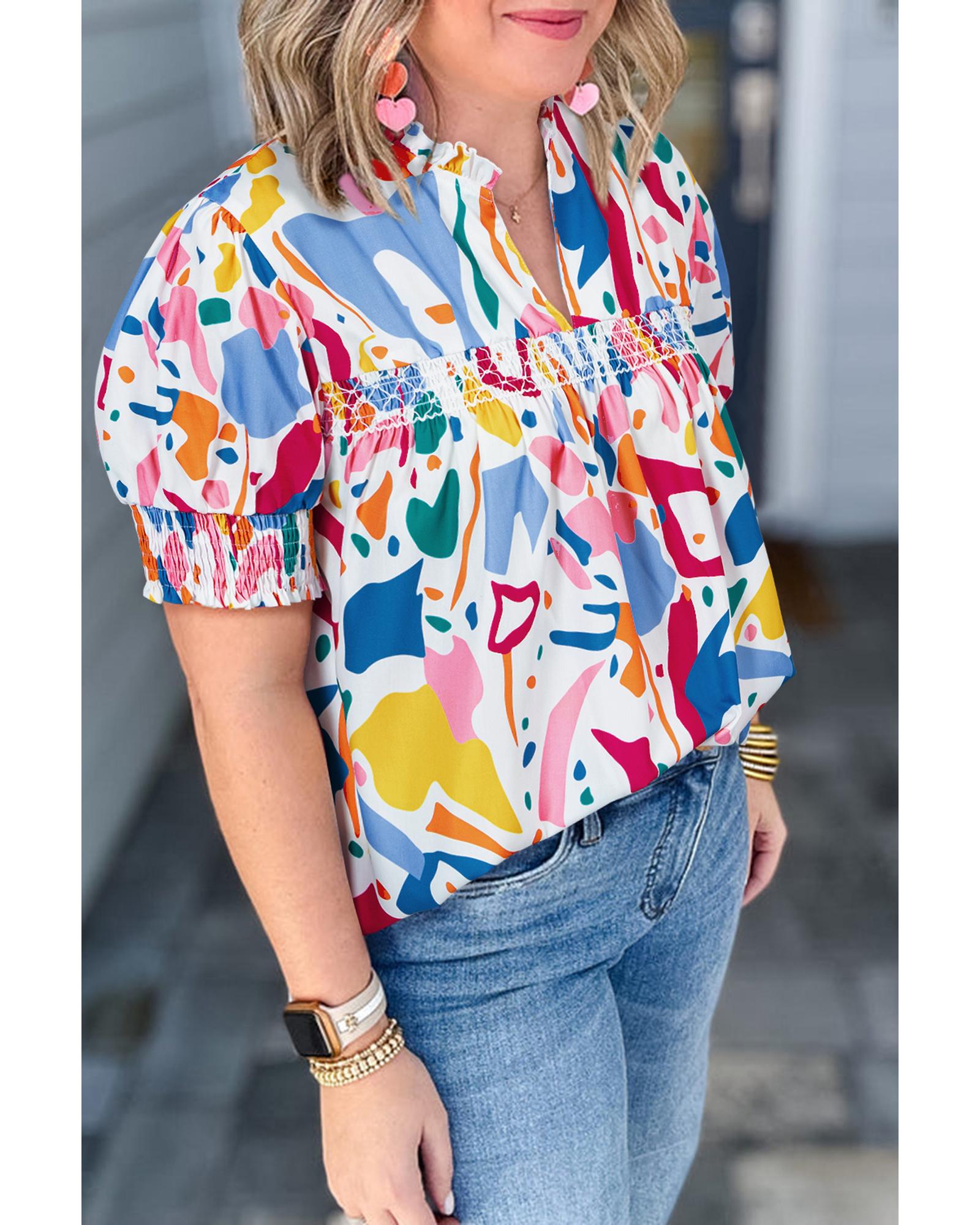 White Abstract Print Shirred Cuff Puff Sleeve Plus Size Blouse – 4X