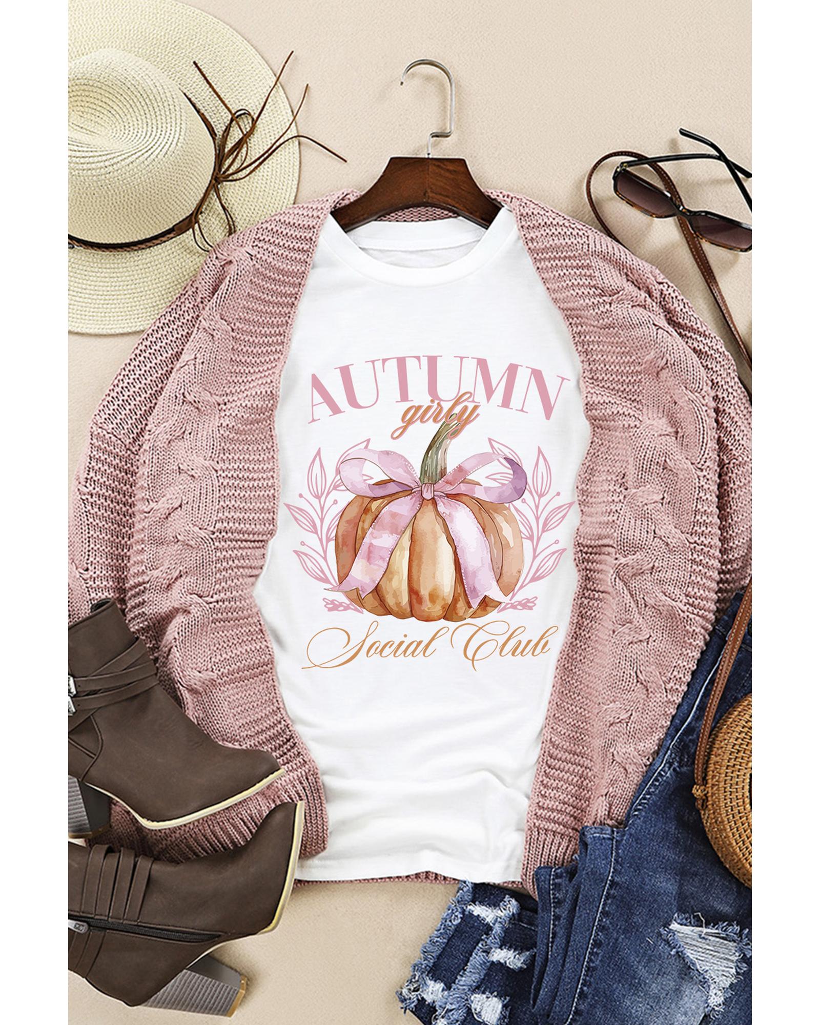 White Autumn Girly Thanksgiving Bowknot Pumpkin Graphic T Shirt – M